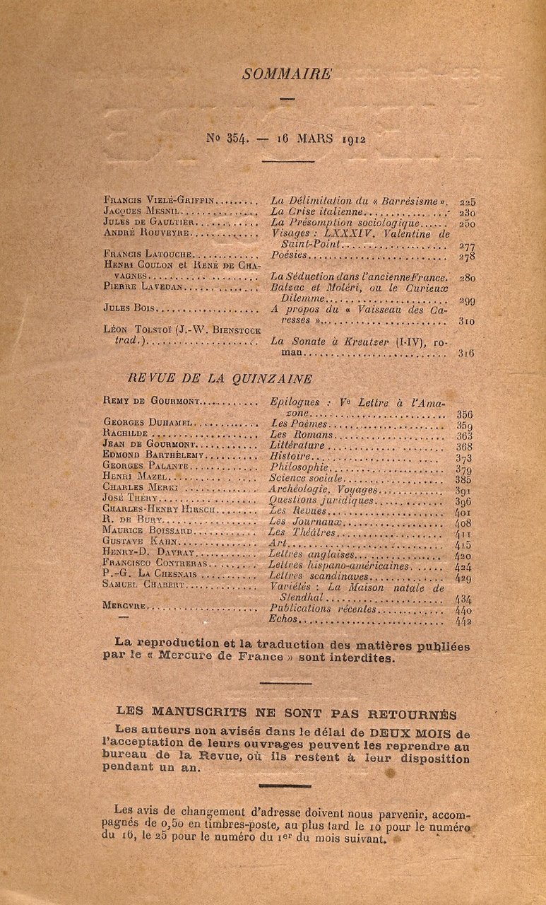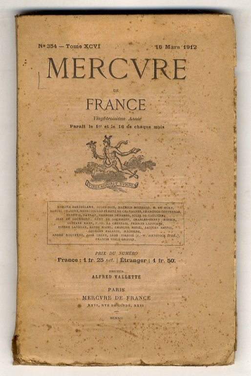 Paris, Mercure de France, 1912, un fascicolo in-8, br. editoriale, pp. numerate da 225 a 448. Testi di F. Vielé-Griffin, P. Lavédan, J. Bois, L. Tolstoï "La Sonate à Kreutzer", G. Duhamel, R. et J. de Gourmont, Rachilde, G. Kahn., ecc.