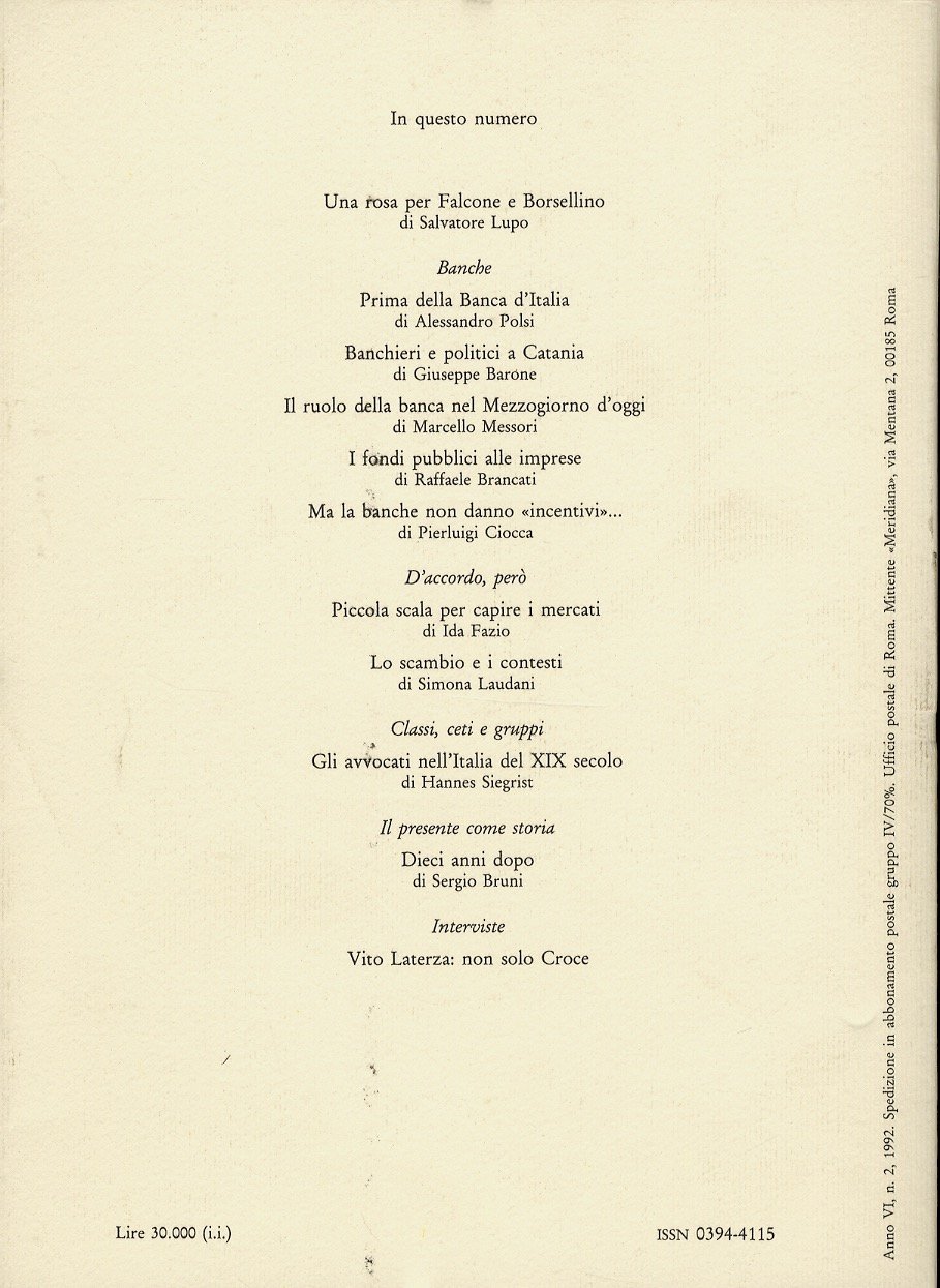 Roma, Istituto Meridionale di Storia e Scienze Sociali, 1992, in-8, br. editoriale, pp. 266. Dall'indice: S. Lupo "Una rosa per Falcone e Borsellino", A. Polsi "Prima della Banca d'Italia. Spinte unificanti e resistenze regionali", G. Barone "Banchieri e politici a Catania. Uno scandalo di fine Ottocento", M. Messori "Il ruolo della banca nel Mezzogiorno d'oggi", Hannes Siegrist "Gli avvocati nell'Italia del XIX secolo. Provenienza e matrimoni, titolo e prestigio", ecc.