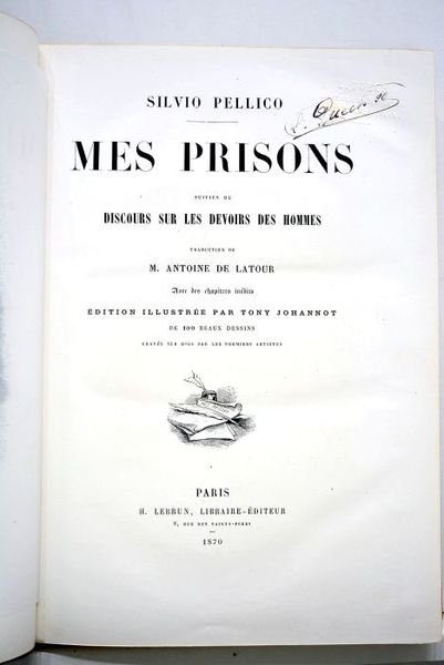 Mes Prisons. Suivies du Discours sur les devoirs des hommes. Traduction de M. Antoine De Latour. Avec des chapitres inédits. Edition illustrée par Tony Johannot de 100 beaux dessins. Gravés sur bois par les premiers artistes.