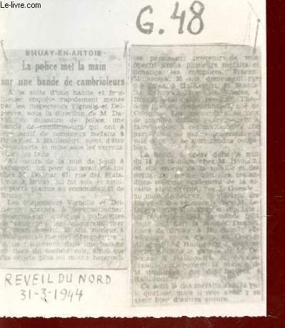MESSAGE-PHOTO EN NOIR ET BLANC ENVOYE PENDANT LA SECONDE GUERRE MONDIALE / SOUS LA REFERENCE G48 / REVEIL DU NORD - EXTRAIT DU 31.03.1944 : "LA POLICE MET LA MAIN SUR UNE BANDE DE CAMBRIOLEURS".