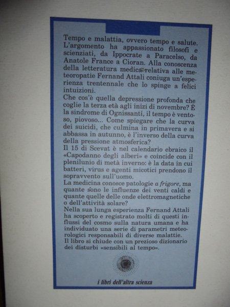 Fernand, Attali. Milano, Xenia Edizioni, 1988. Meteoropatie condizioni atmosferiche e salute. In-16°, cartoncino edit. con alette. 174 pp. Libro in stato di nuovo. Neg. med.