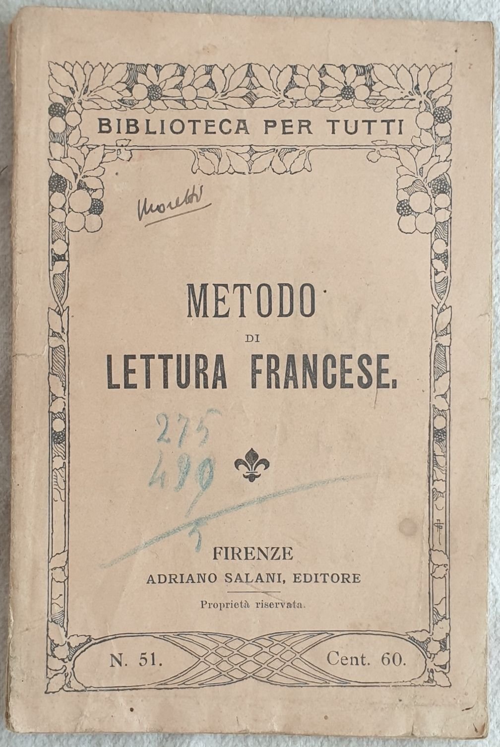 Edizione del 1922 di questo manuale per la lettura francese della collana "Biblioteca per tutti". All'interno: Regole generali di pronunzia, Letture per esercizio di nomenclatura, Lecture courante. Note manoscritte. In buone condizioni. Copertina editoriale in buone condizioni generali con lievi usure ai margini e dorso. Legatura in buone condizioni. All'interno le pagine si presentano in ottime condizioni con rare fioriture. In 16. Dim. 16,5x11 cm. Pp. 70+(2). Edition of 1922 of this manual for french reading of the series "Biblioteca per tutti". Inside: Rules for pronounciation, Exercise for names, Lecture courante. Handwritten notes. In good conditions. Editorial cover in good general conditions slightly worn in the edges and spine. Binding in good conditions. Pages in very good conditions with occasional foxings. In 16. Dim. 16,5x11 cm. Pp. 70+(2).