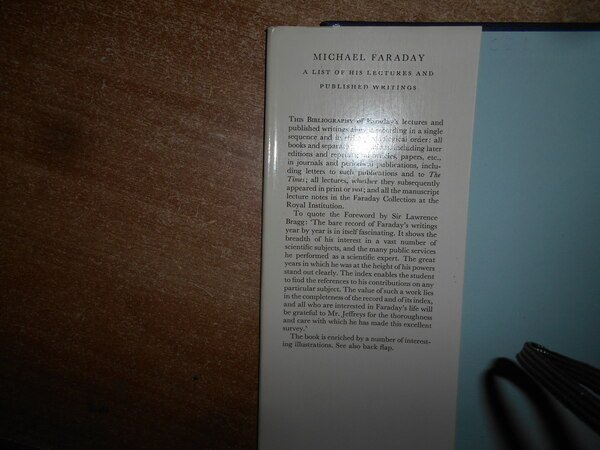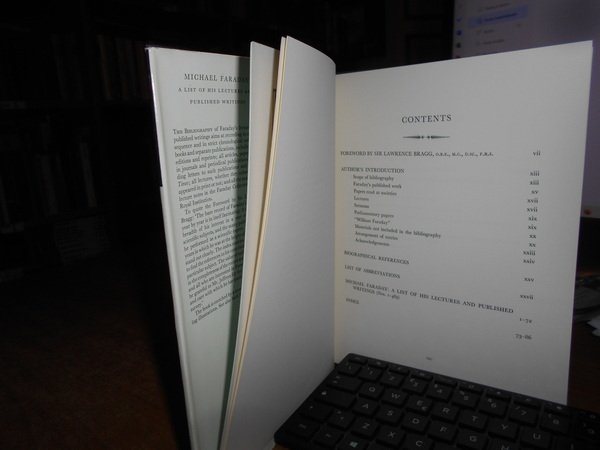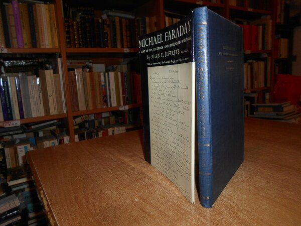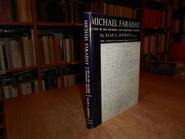 By Alan E. Jeffreys. With a Foreword by Sir Lawrance Bragg. London, Published on Behalf of The Royal Institution of Great Britain, 1960. MICHAEL FARADAY A List of His Lectures and Published Writings. In-8°, tela bleu con titoli in oro al dorso e sul piano, sovracopertina. (xxviii), 86 pp. con alcune illustrazioni n.t. Ottimo stato. Uff. D - III - 1