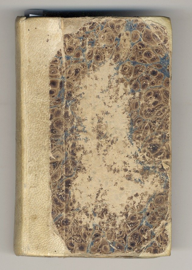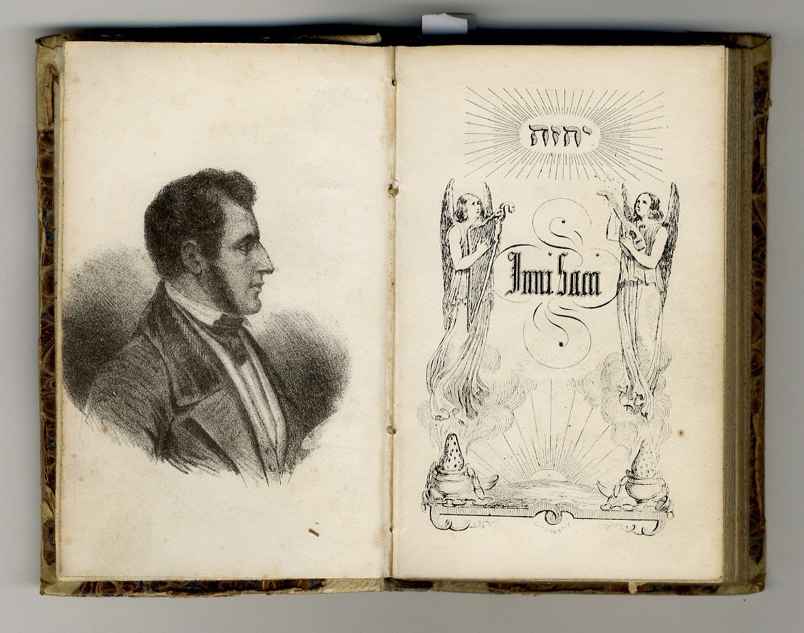 Firenze e Fano, Presso l'Editore G. A. Gabrielli, 1842, in-24, mezza pergamena coeva, dorso muto, piatti marmorizzati, tagli spruzzati di azzurro, pp. XXVII, (1), 423, (1). Con doppio frontespizio (uno calcografico: titolo racchiuso fra due angeli che suonano arpa e liuto e nome di "Yahweh" in caratteri ebraici), 3 tavole coi ritratti litografici di Manzoni, Pellico e Perticari. Esemplare firmato dall'editore. Ottime condizioni salvo piatti un po' erosi.4