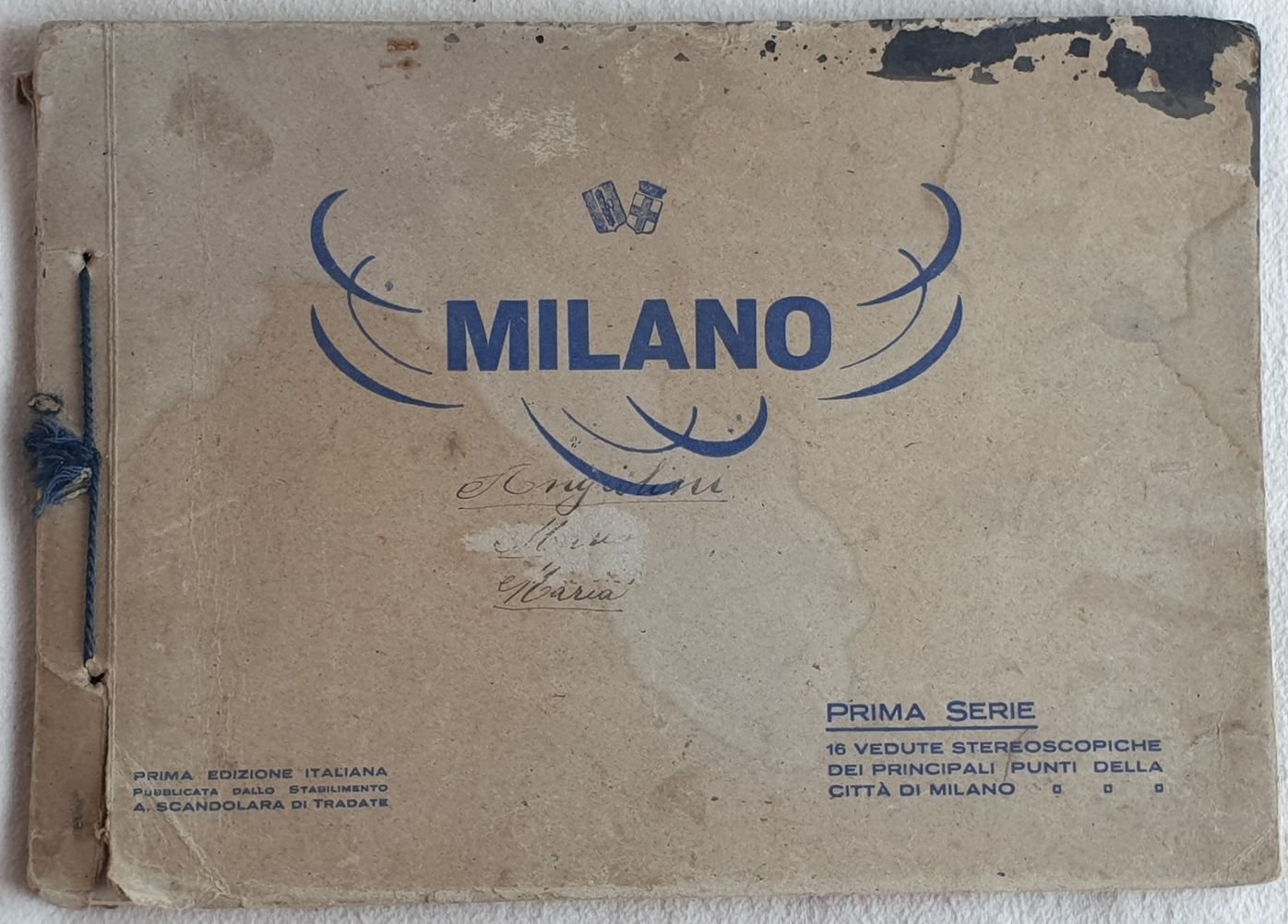 Edizione degli anni '20 di questa pubblicazione contenente 16 vedute stereoscopiche della città di Milano. All'interno monumento a Vittorio Emanuele II, monumento al Generale Missori, Porta Ticinese, Bastioni di Porta Venezia ecc. Antica firma in copertina. In buone condizioni. Copertina editoriale coeva in buone condizioni generali con usure ai margini e dorso. Macchie di inchiostro marginali che non inficiano le foto. Legatura in buone condizioni. All'interno le pagine si presentano in buone condizioni con rare fioriture. Alcune segni a matita a causa delle quali le illustrazioni 2, 3, 4 risultano danneggiate. Usura alla planche 9. In 8. Dim. 17,5x25 cm. Pp. (16).Edition of 1920's of this pamphlet containing 16 stereoscopic views of the city of Milan. Inside monument to Vittorio Emanuele II, to General Missori, Porta Ticinese, Bastioni di Porta Venezia ecc. Ancient signature in the covr. In good condition Editorial cover in good general conditions with wearings in the edges and spine. Ink stains in the edges not ruining the illustrations. Binding in good conditions. Pages in good conditions with occasional foxings. Some signs made with pencil to illustrations 2, 3, 4 are damaged. Wearings in planche 9. In 8. Dim. 17,5x25 cm. Pp. (16).