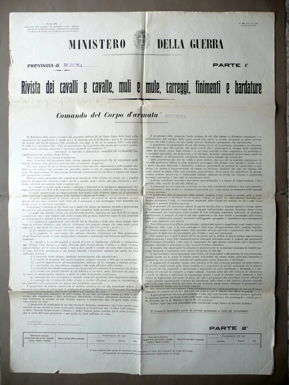 Ministero della Guerra Rivista Cavalli Muli Carreggi Finimenti Bardature 1939