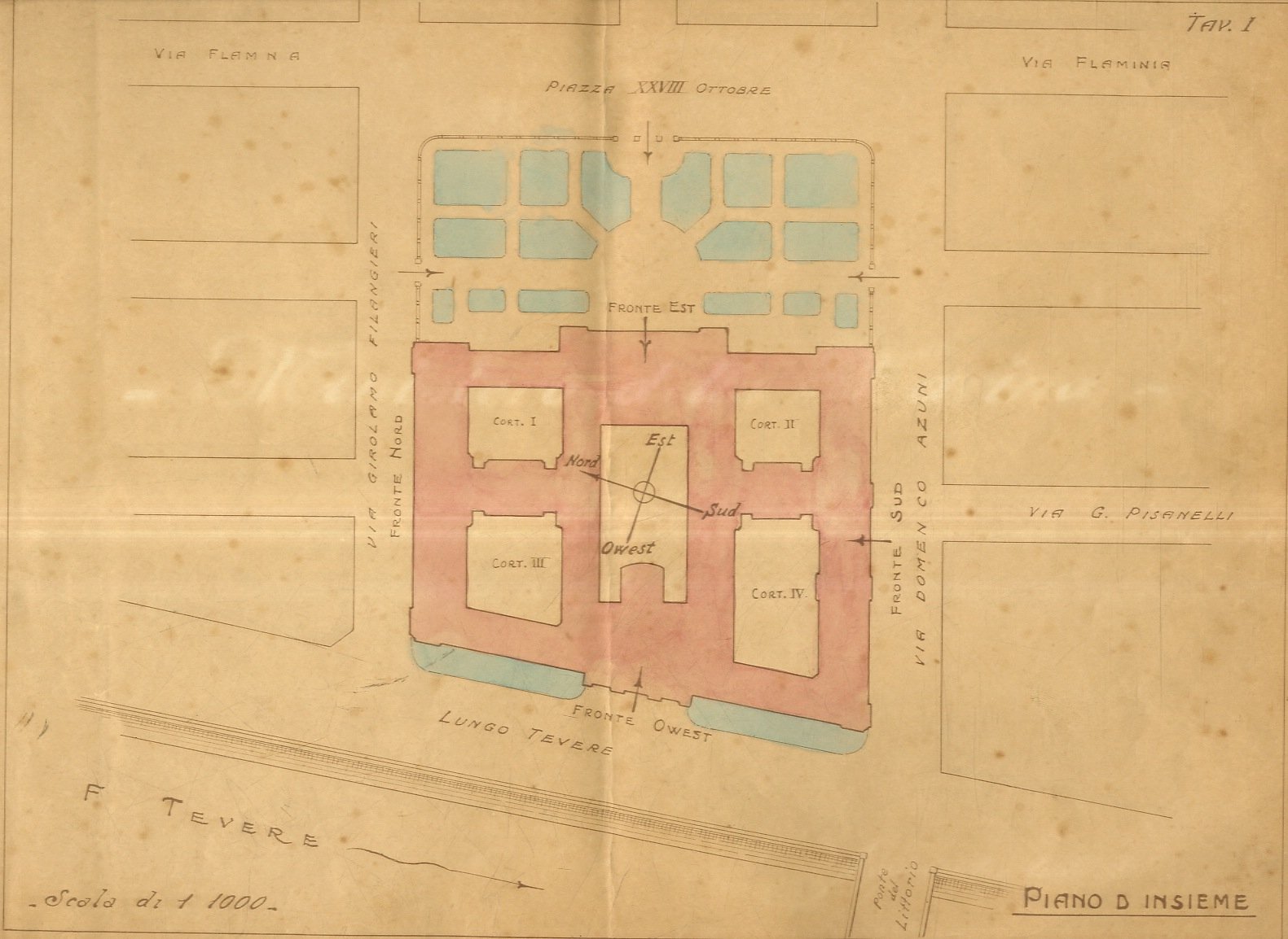 [Roma, c. 1931], album contenente 10 tavole impresse in seppia con particolari colorati a mano: si tratta di sezioni e planimetrie del palazzo sul Lungotevere delle Navi, alcune con notazioni marginali manoscritte. Due note, anch'esse manoscritte, sulla copertina anteriore: "Sig. Gen. Lavezzari" e "Aggiornato a tutto il 1931". Il palazzo fu progettato dell'architetto Giulio Magni, nipote di Valadier. I lavori, iniziati nel 1912, terminarono nel 1928. La creazione del palazzo si rese necessaria per fronteggiare l'ampliamento dei programmi navali decisi dall'allora Ministro della Marina Ammiraglio Paolo Thaon di Revel.