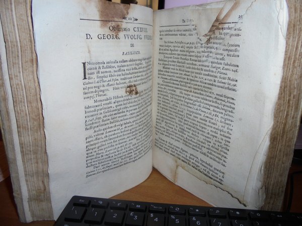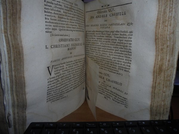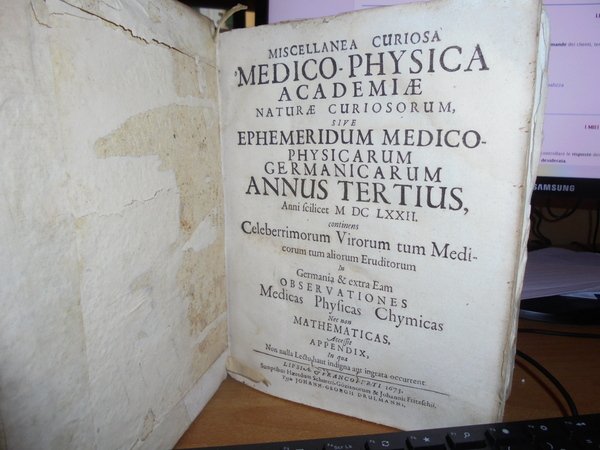 MISCELLANEA curiosa medico - physica Academiae naturae curiosorum sive Ephemeridum medico - physicarum germanicarum annus tertius, anni scilicet 1672 continens celeberrimorum virorum tum nedicorum tum aliorum eruditorum in Germania et extra eam observationes medicas, physicas, chymicas nec non mathematicas. Lipsiae et Francofurti, typis Iohann - Georgii Drulmanni, 1673. In - 4°, pergamena coeva. (24), 616, (16) pp. con alcune illustrazioni n.t. e numerose tavole f.t. (molte staccate). Mancano le pp. 71 - 72; le pp. 201 - 208 presentano strappi con mancanze di testo e qualche macchia scura. Esemplare sciupato e scompleto. Può comunque interessare a scopo di studio. Nonostante i difetti descritti l' esemplare è ben conservato. Neg. Mob. 5