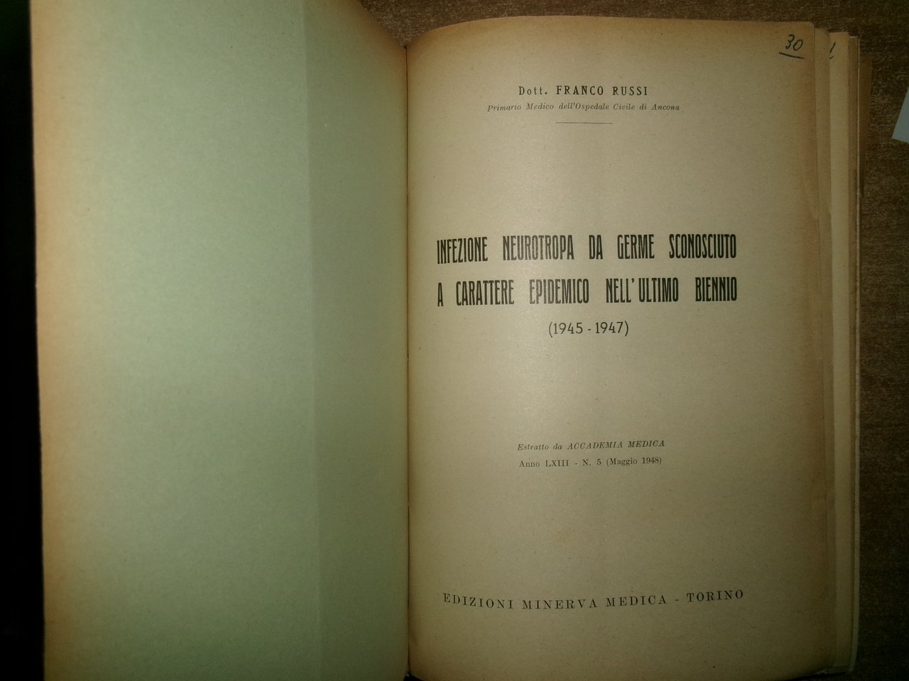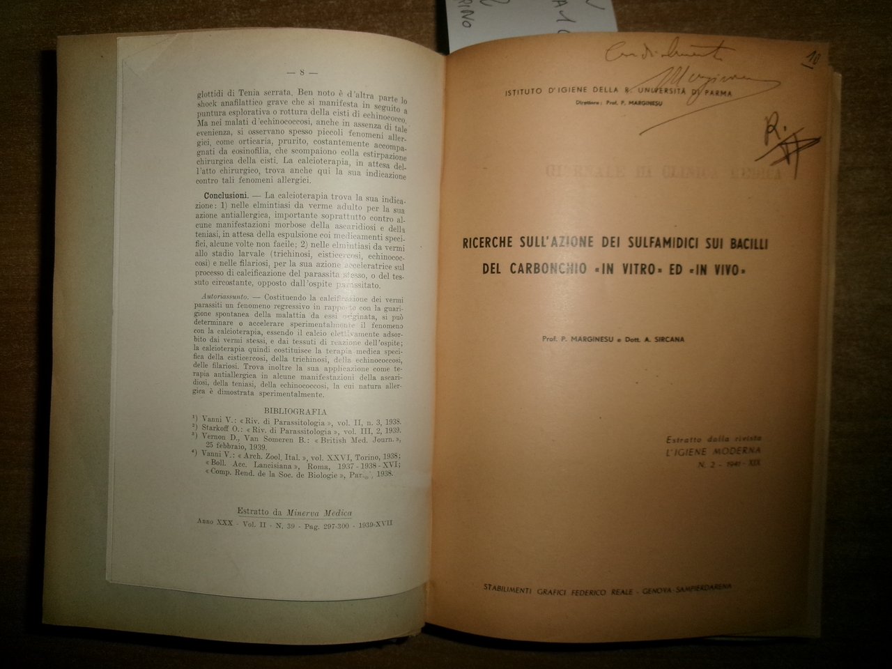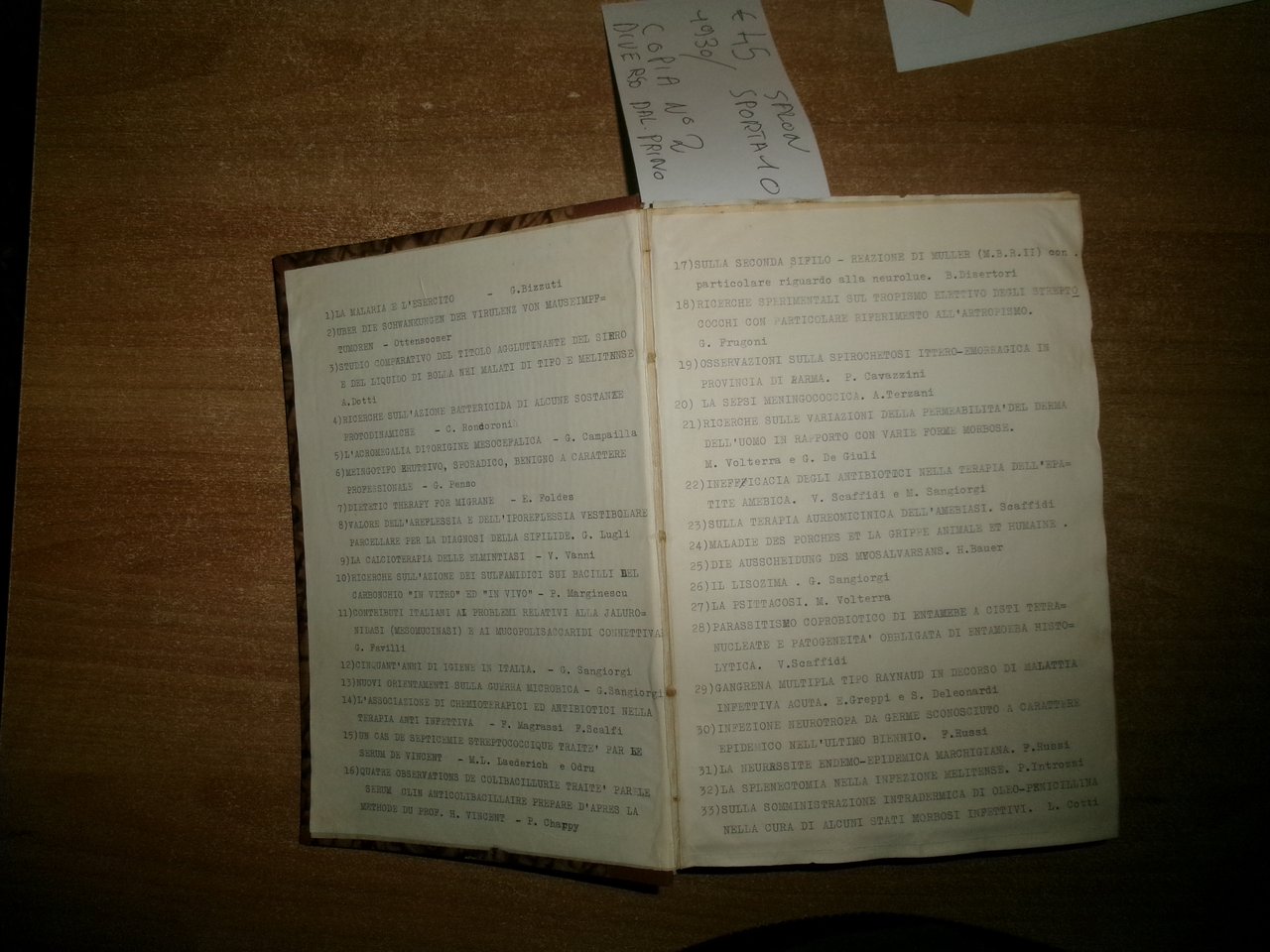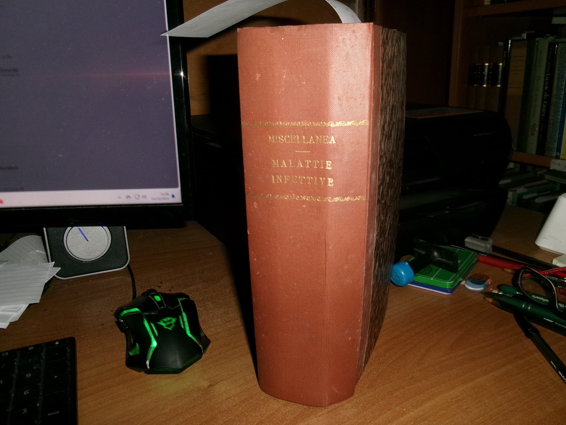 AA. VV. MISCELLANEA di numerosi estratti/opuscoli riguardanti le malattie infettive. Raccolta di numerosi opuscoli/estratti con varie date (dal 1930 in poi) rilegati in un volume in-8°, m-tela con titolo in oro sul dorso con alcune illustrazioni in nero n.t. Testi la maggior parte in italiano ma anche tedesco/inglese e francese con varie dediche al Prof. Domenico Campanacci (alcune firmate dagli Autori). Indice dattiloscritto all' inizio del libro. Controllare in caso di vendita quale copia E'. (vedi indice). Uff. salon. sporta 10