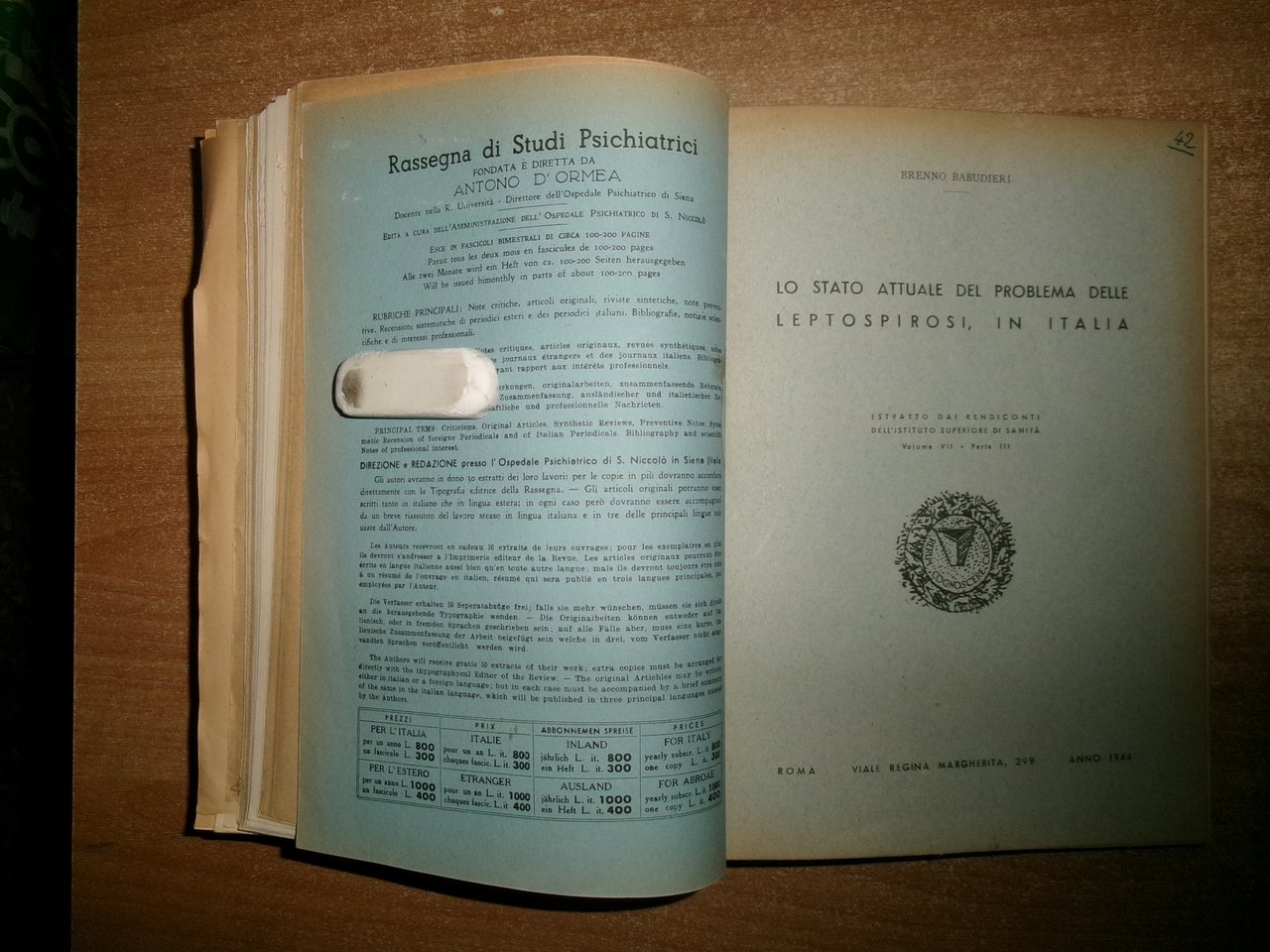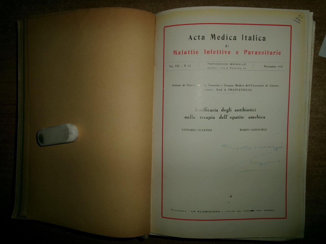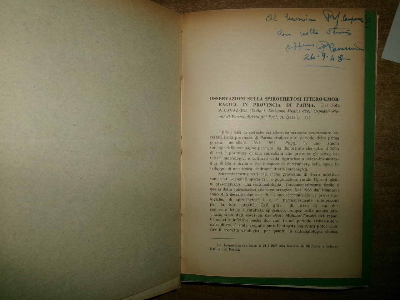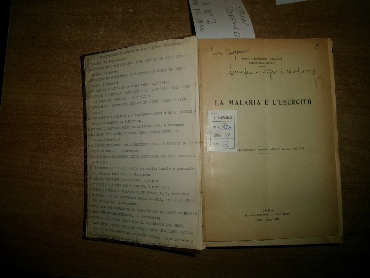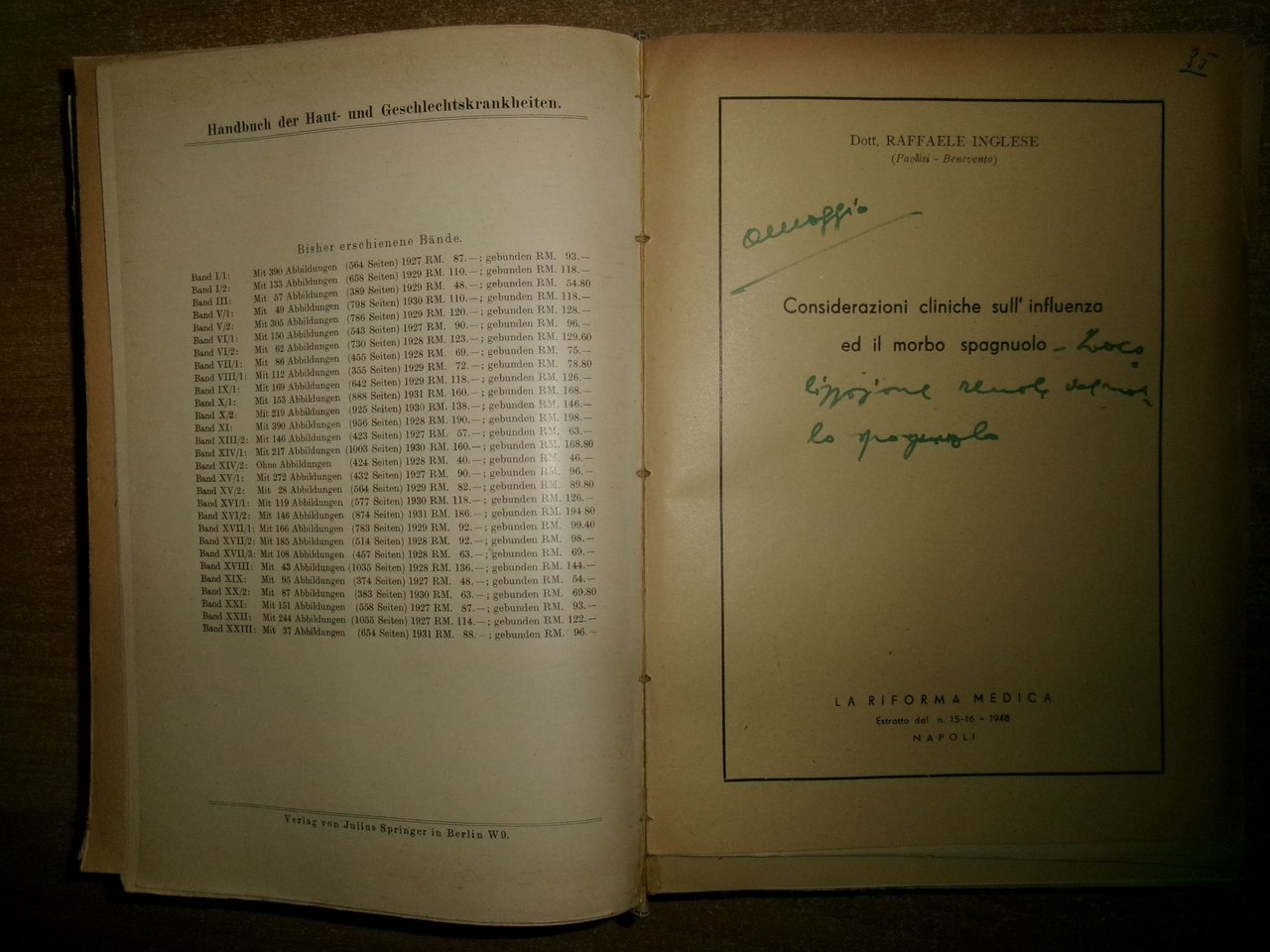AA. VV. MISCELLANEA di numerosi estratti/opuscoli riguardanti le malattie infettive. Raccolta di numerosi opuscoli/estratti con varie date (dal 1930 in poi) rilegati in un volume in-8°, m-tela con titolo in oro sul dorso con alcune illustrazioni in nero n.t. Testi la maggior parte in italiano ma anche tedesco/inglese e francese con varie dediche al Prof. Domenico Campanacci (alcune firmate dagli Autori). Indice dattiloscritto all' inizio del libro. Controllare in caso di vendita quale copia E'. (vedi indice). Uff. salon. sporta 10