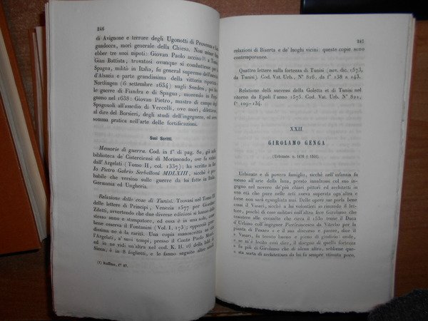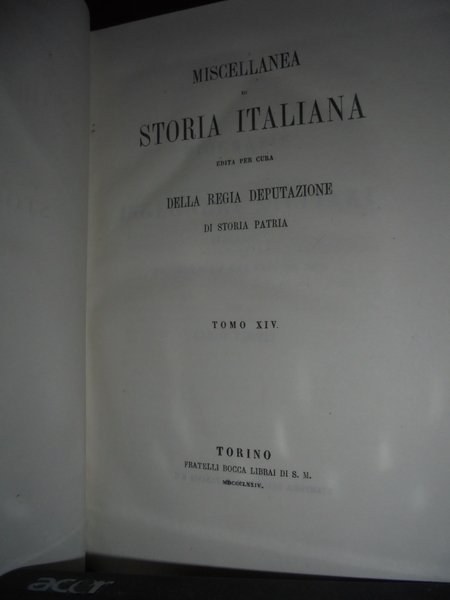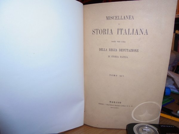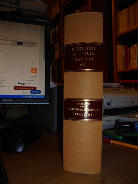CARLO, PROMIS. Miscellanea di Storia Italiana. Edita per cura della Regia Deputazione di Storia Patria. Ingegneri Militari Italiani.Tomo XIV. Torino, Presso I Fratelli Bocca Librai di S. M., MDCCCLXXIV. In-8°, tela con titoli entro tasselli ai dorsi, copertina originali conservate. 858 pp. con alcune tavole ripiegate incise f.t. Bell' esemplare in legatura nuova (intonso). A - I - 3 - 2