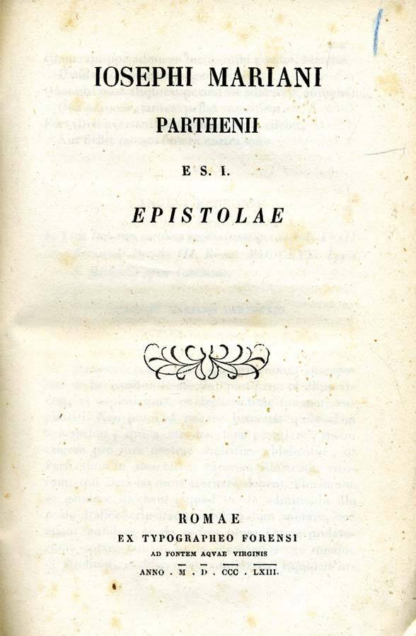 NEL VOLUME SONO CONTENUTE LE SEGUENTI OPERE: IOSEPHI MARIANI PARTHENII "EPISTOLAE" 1863 TYPOGRAPHEO FORENSI; AA.VV. " GLORIA POSTUMA SOCIETATIS JESU" 1814 FRANCISCUM BOURLIE ; P. SIMONIS ROFRIGUEZ " DE ORIGINE ET PROGRESSU SOCIETATIS IESU" 1869 TYPIS CIVILITATIS CATHOLICAE V Numero Pagine 103