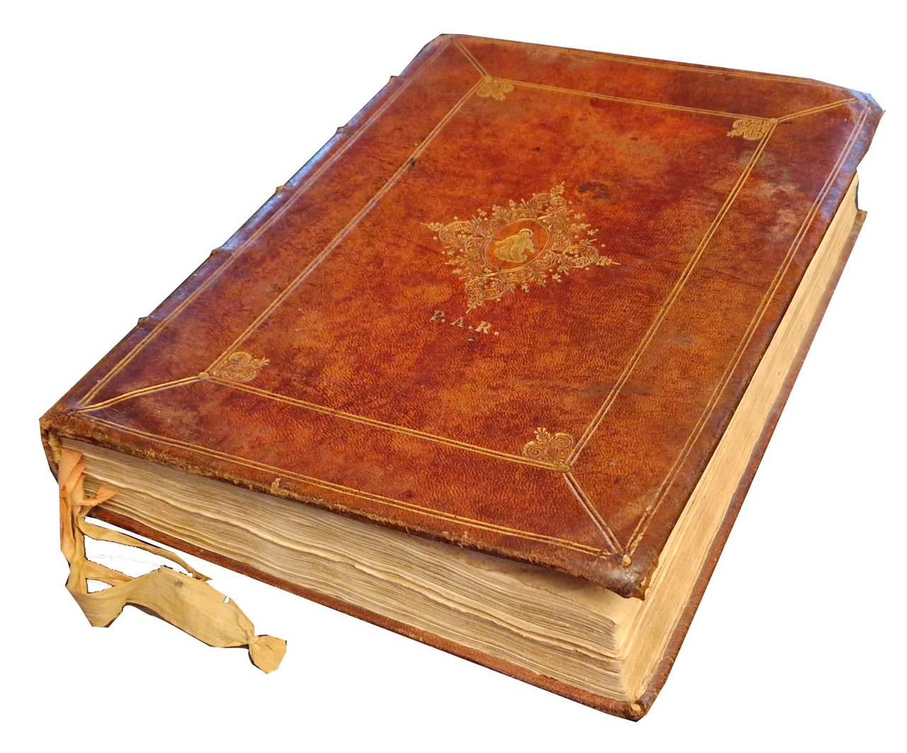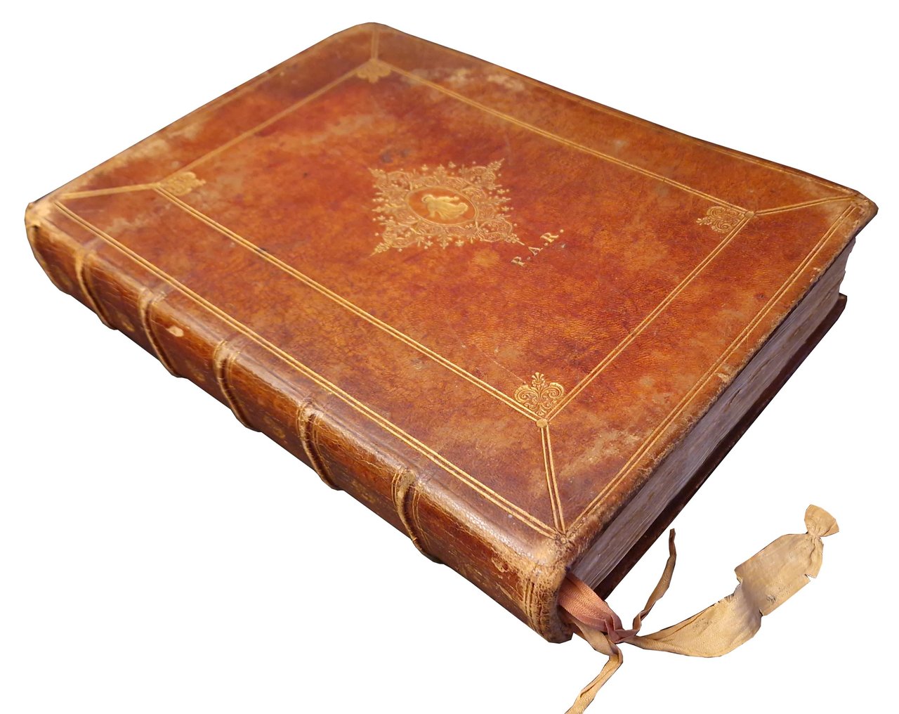 in-folio, 320x224 mm, leg. ottocentesca in pelle, con impressioni e decori in oro, dorso a cinque nervi, nastrini segnapagina in seta; tre opere legate in un volume; [1.]: pp. [28], 428, lxxx. Frontespizio in rosso e nero inquadrato da cornice tipogr. a doppio filetto con vignetta calcografica sottoscritta: Suor Isabella P. S. Testo stampato in rosso e nero e disposto su due colonne. Incisioni xilografiche a piena pagina a cura di Suor Isabella Piccini (1644-1734), monaca e specialista dell'incisione italiana, particolarmente apprezzata per l'abilità chiaroscurale nella tecnica a bulino. Rif.: IT\ICCU\UM1E\042201. Cond.: Normali segni d'uso alla legatura per questo tipo di opera (lievi abrasioni e piccoli graffi). Carte interne abbastanza pulite, spesse e croccanti, con presenza di macchie d'umido nell'angolo esetrno superiore al frontespizio e alle prime carte, occasionali macchie ad alte carte, macchie d'umido alle ultime carte. Bell'esemplare con legatura di pregio, in buone condizioni generali.