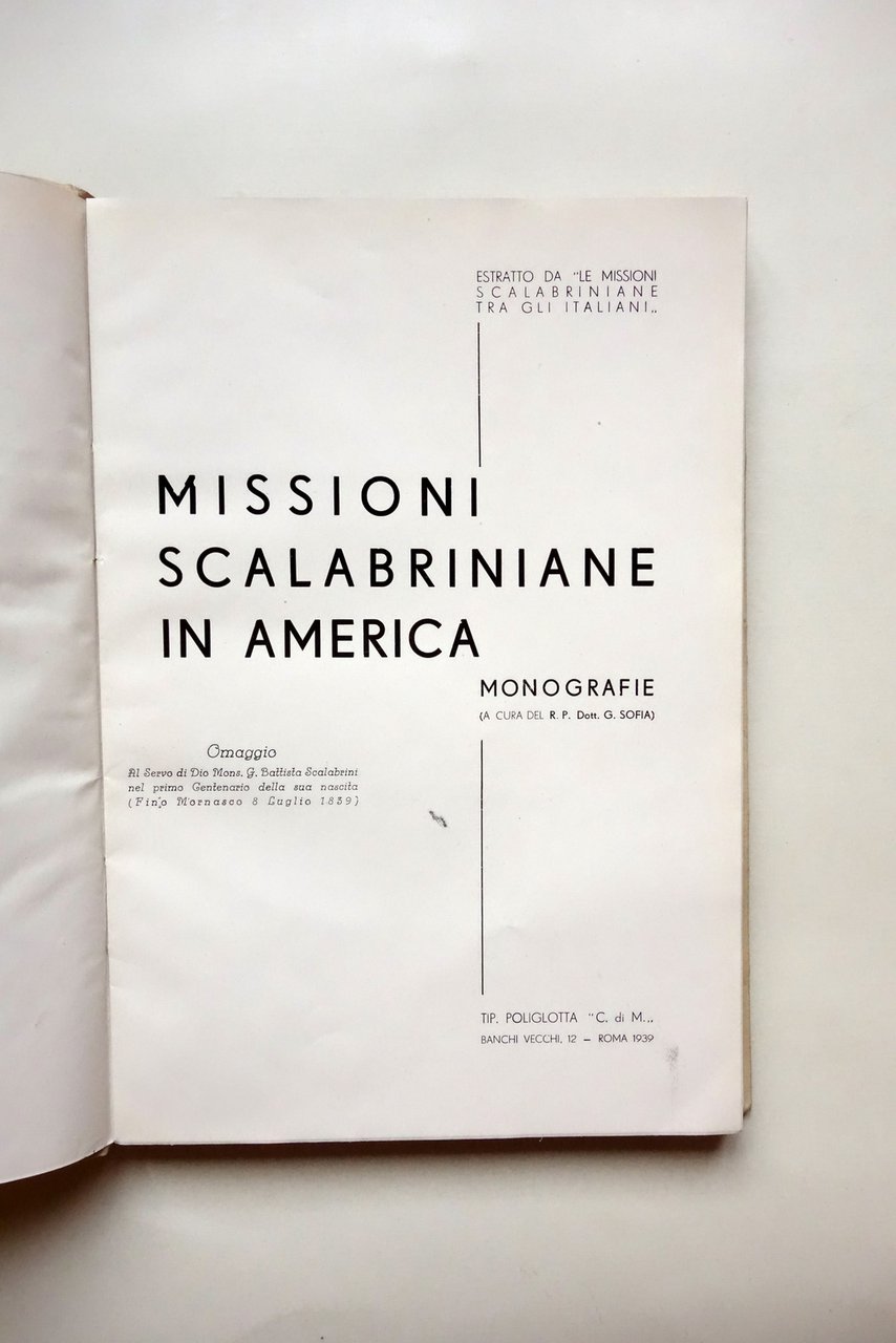 Missioni Scalabriniane in America Monografie G. Sofia Tip. Poliglotta Roma 1939