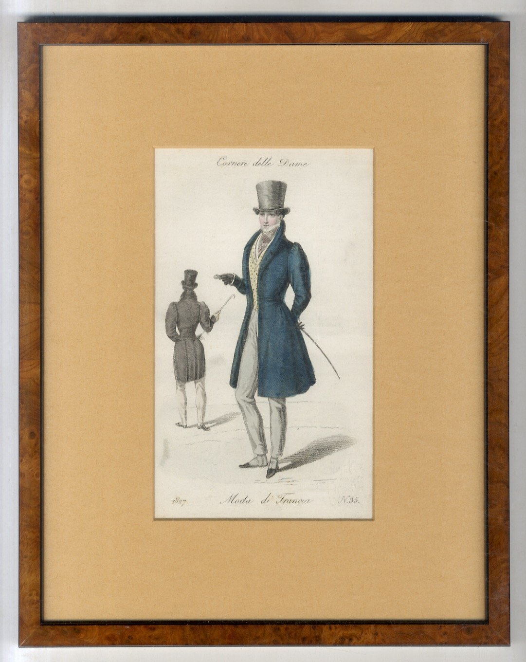 [Milano], Corriere delle Dame, 1837, piacevole incisione acquerellata a mano d'epoca, raffigurante due figure in abiti ottocenteschi maschili. Misure dell'incisione mm. 200x123. In passepartout, entro cornice moderna in radica lucidata e vetro di protezione. Misure della cornice: mm. 340x269. Ottime condizioni.