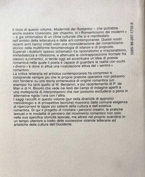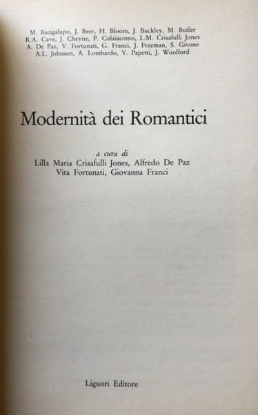 Il titolo di questo volume, Modernità del Romantici che potrebbe anche essere rovesciato, per chiasmo, in Romanticismo dei moderni, è già sintomatico di un clima culturale che si è manifestato nell'ambito della letteratura e delle arti contemporanee. Questi nostri recenti anni hanno infatti visto una riconsiderazione del romanticismo storico nella multiforme fenomenologia di istanze e di proposte. Superati i dualismi spesso schematici tra razionalismo e irrazionalismo, immediatezza e riflessione, e attenuata la contrapposizione frontale fra classici e romantici, si tende oggi ad accentuare un'idea di poesia romantica nella quale il poeta é capace di guardare la realtà con occhi diversi e dove si attua una rivalutazione attiva del sentire romantico. La critica letteraria ed artistica contemporanea ha compreso e comprende sempre più che le proprie pratiche operative non possono non fondarsi su una teoria ermeneutica di origine romantica (un esempio fra tanti quello di W. Benjamin, e più recentemente di P. de Man e di H. Bloom) che vede nei testi dei campi di indagine aperti a una molteplicità di interpretazioni che non possono escludersi o porsi in alternativa rigida l'una con l'altra. I saggi raccolti in questo volume (pur nella diversità di approcci metodologici e di prospettive teoriche) muovono dalla comune esigenza. di ripercorrere le tappe più salienti della cultura e dell'estetica romantica. Di qui il progetto di rivisitare i percorsi creativi, le pratiche testuali e le modalità di pensiero del movimento romantico non solo nella sua specifica storicità epocale, ma altresì nel proprio scandirsi in un tempo ulteriore a livello delle successive vicende letterarie ed artistiche della cultura dell'Occidente.
