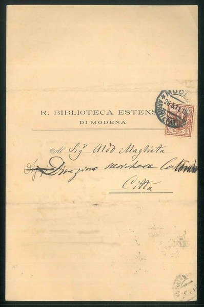 Modulo di richiesta di restituzione di libri in prestito compilato a penna. Modena 26 Maggio 1911