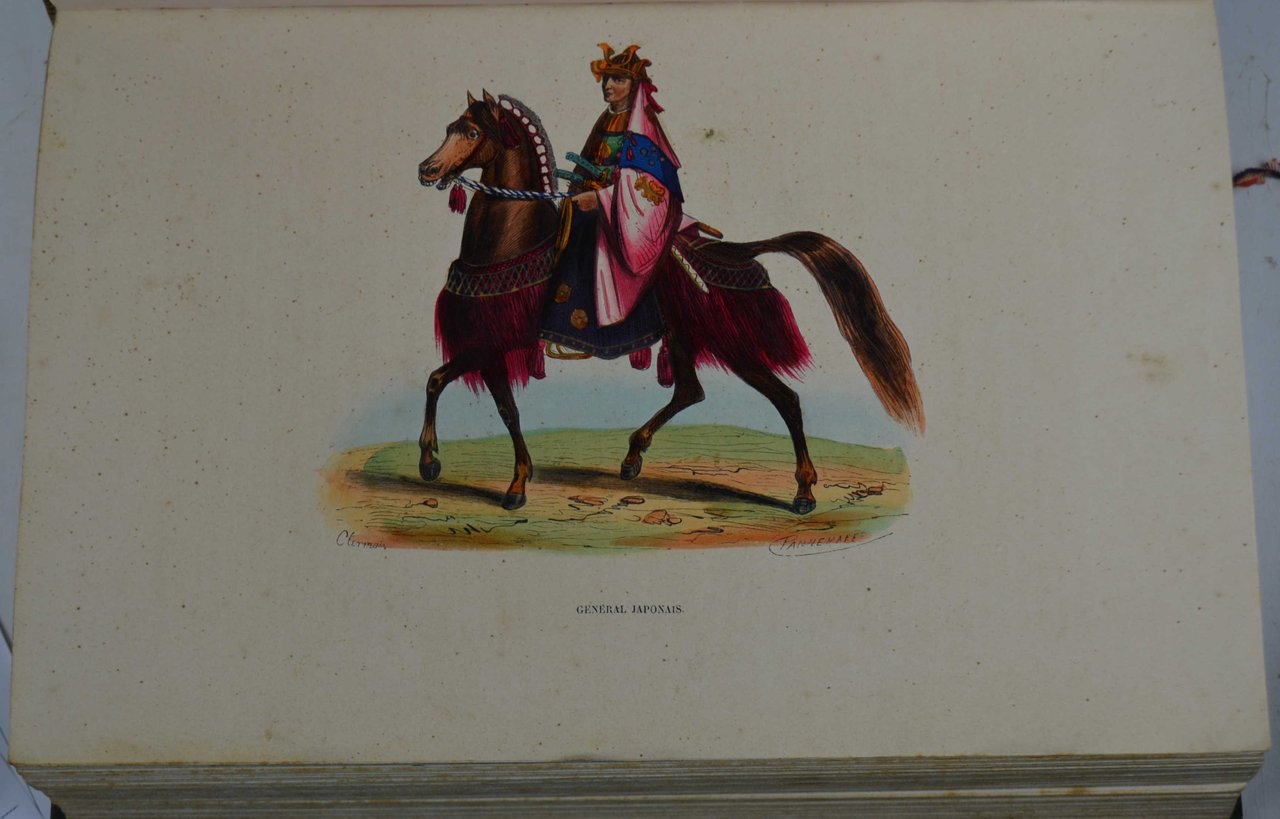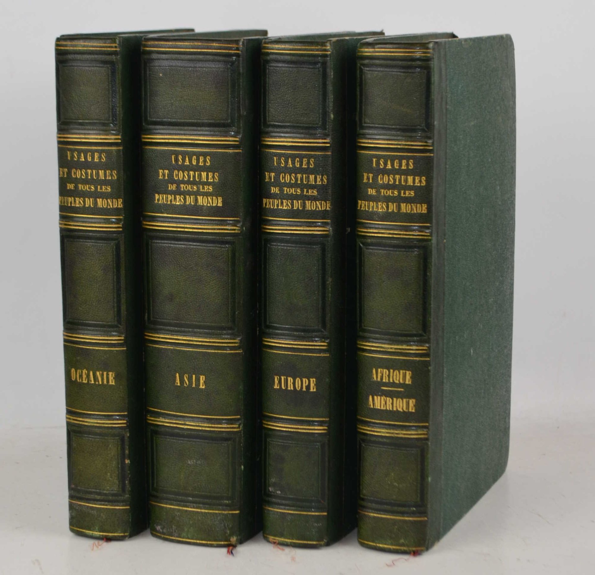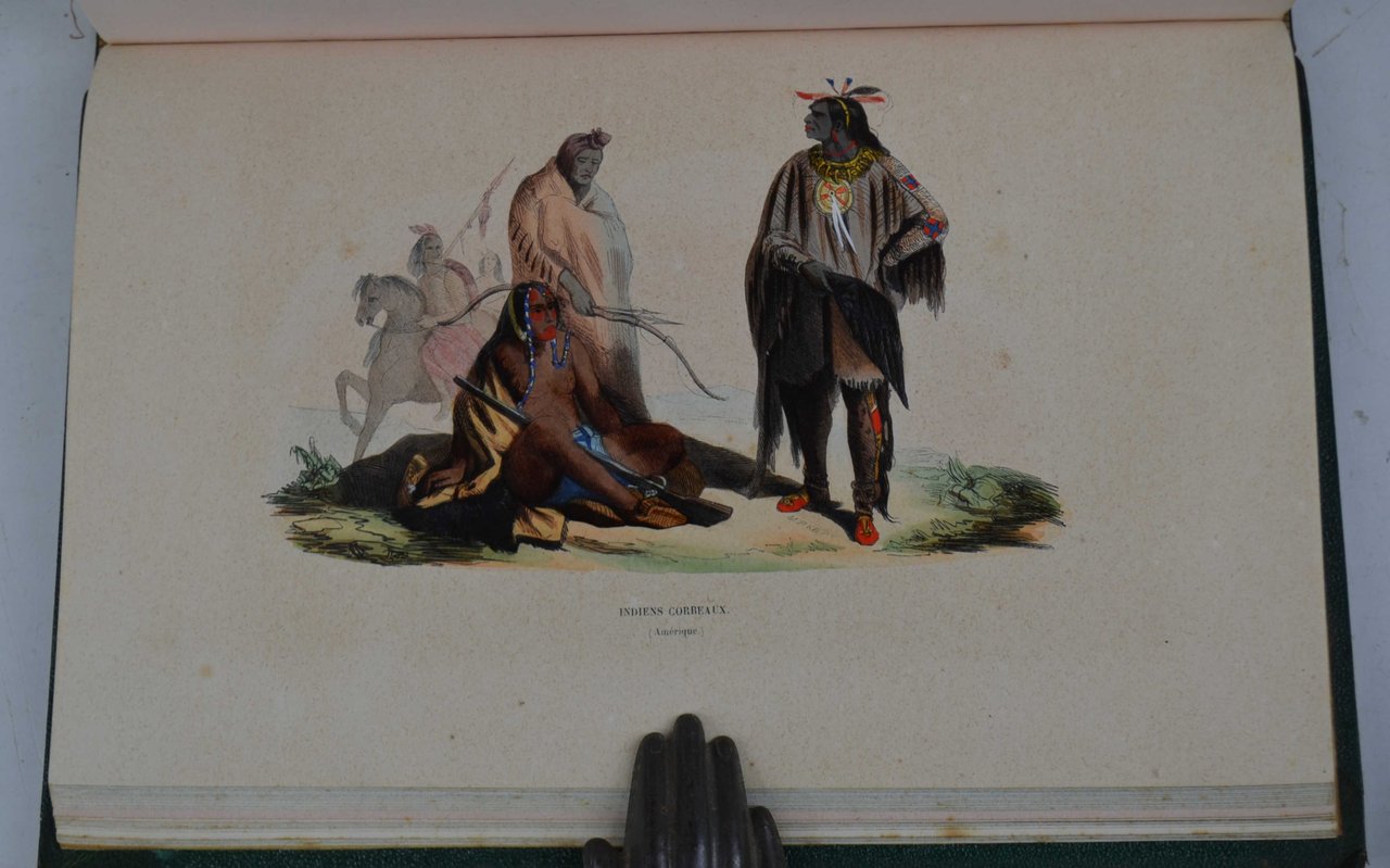 Quattro volumi di cm. 26, pp. 1.700 ca. complessive. Vignetta colorata incisa a ciascuno dei quattro frontespizi e 205 bellissime tavole fuori testo di costumi in fine coloritura d'epoca (ciascuna protetta da velina). Solida ed elegante legatura coeva in mezza pelle verde, dorsi a nervi con titoli e filetti in oro ai comparti. Esemplare genuino fresco e ben conservato, con le tavole in coloritura particolarmente fresca. Opera che apparve con un numero sempre variabile di tavole. Nel nostro esemplare comunque il numero è superiore a quallo annunciato dagli indici posti in fine a ciascun volume. Opera celebre e non comune munita di un interessante apparato iconografico raffigurante una grande quantità di personaggi atti a mostrare i costumi locali d'ogni parte del mondo. Suddivisa in quattro parti principali: Europa, Oceania, Asia, Africa-America.