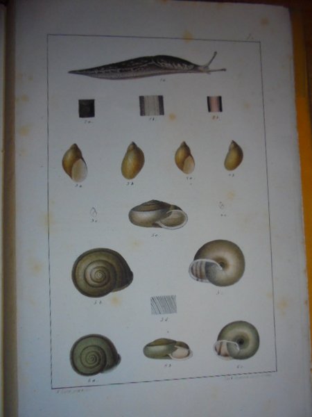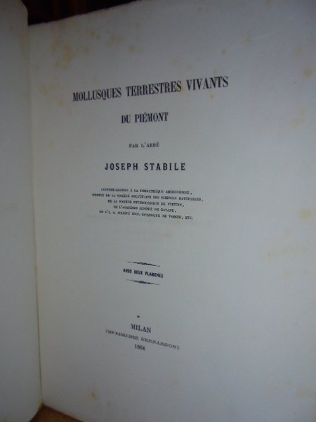 Mollusques terrestres vivants du Piémont. STABILE, Joseph. Milan, Bernardoni, 1864. In - 8° grande, br. cop. orig. 141, (1) pp. e 2 tavole (una a colori) f.t. Edizione a tiratura limitata estratta dagli Atti della società di Scienze Naturali. Ottimo esemplare. Neg. mob. 6