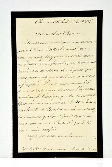 1 page 1/2. (18x11 Cm). Remerciements en réponse aux condoléances envoyées par le Baron de Sers à l'occasion de la mort du Roi Louis-Philippe. Louis d'Orléans souligne sa confiance en la fidélité du baron à la famille royale. Il était le deuxième fils du Roi Louis-Philippe et de la Reine Amélie, prit part à plusieurs expéditions coloniales (Algérie, Constantine). A tort ou à raison, il passait pour un partisan des idées de l'Ancien Régime, pour un prince d'un caractère froid et fier, ce qui l'avait fait surnommer le gentilhomme de la famille. L.A.S. sur papier de deuil, au baron de Sers, qui fut préfet de la Moselle, puis de la Gironde et Pair de France. Légers plis.