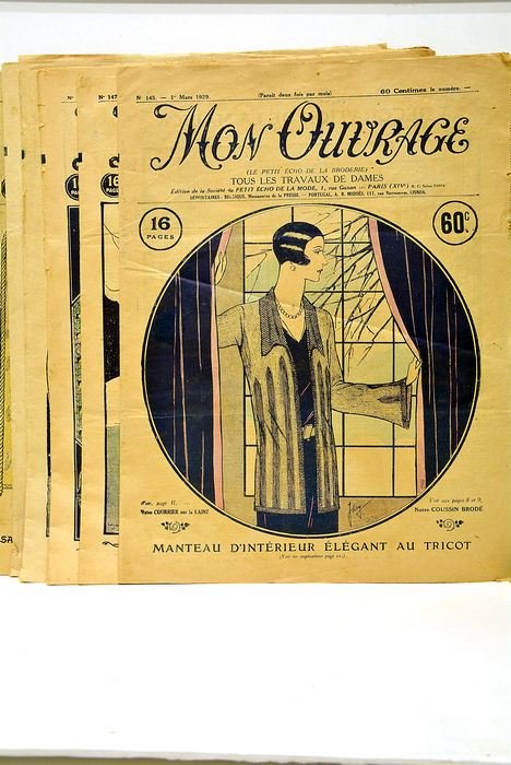 6 numéros, dont chacun compte 15 pages. (38x29 Cm). Brochés. Couvertures illustrées. Rares taches et petits accrocs. Revue bimensuelle richement illustré, centrée sur les travaux d’aiguilles pour femmes (broderie, tricot, crochet, etc.), éditée par la Société anonyme du Petit Écho de la mode, à Paris.