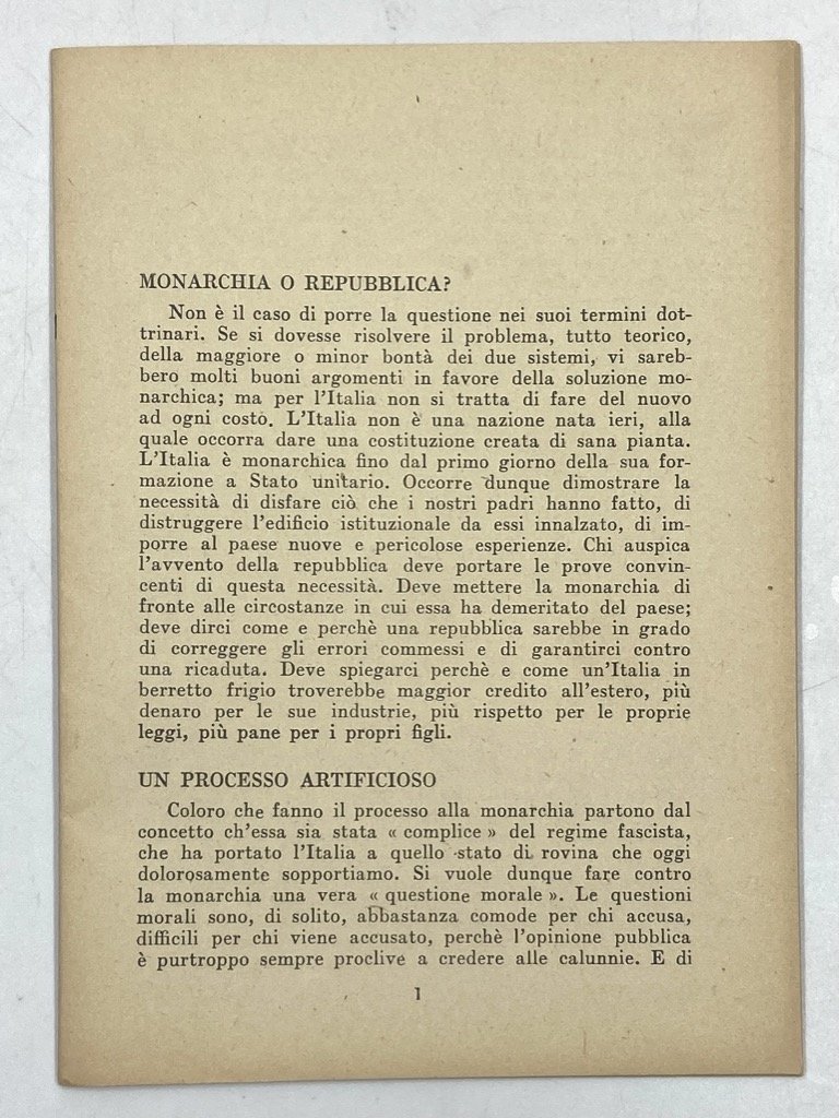 Opuscolo spillato, senza copertina, cm12x17, pp 15 (1). Opuscolo anonimo che ripercorre la storia dei rapporti fra monarchia e fascismo con l’intenzione di dimostrare la necessità della prima quale garanzia contro i partiti totalitari (comunisti).