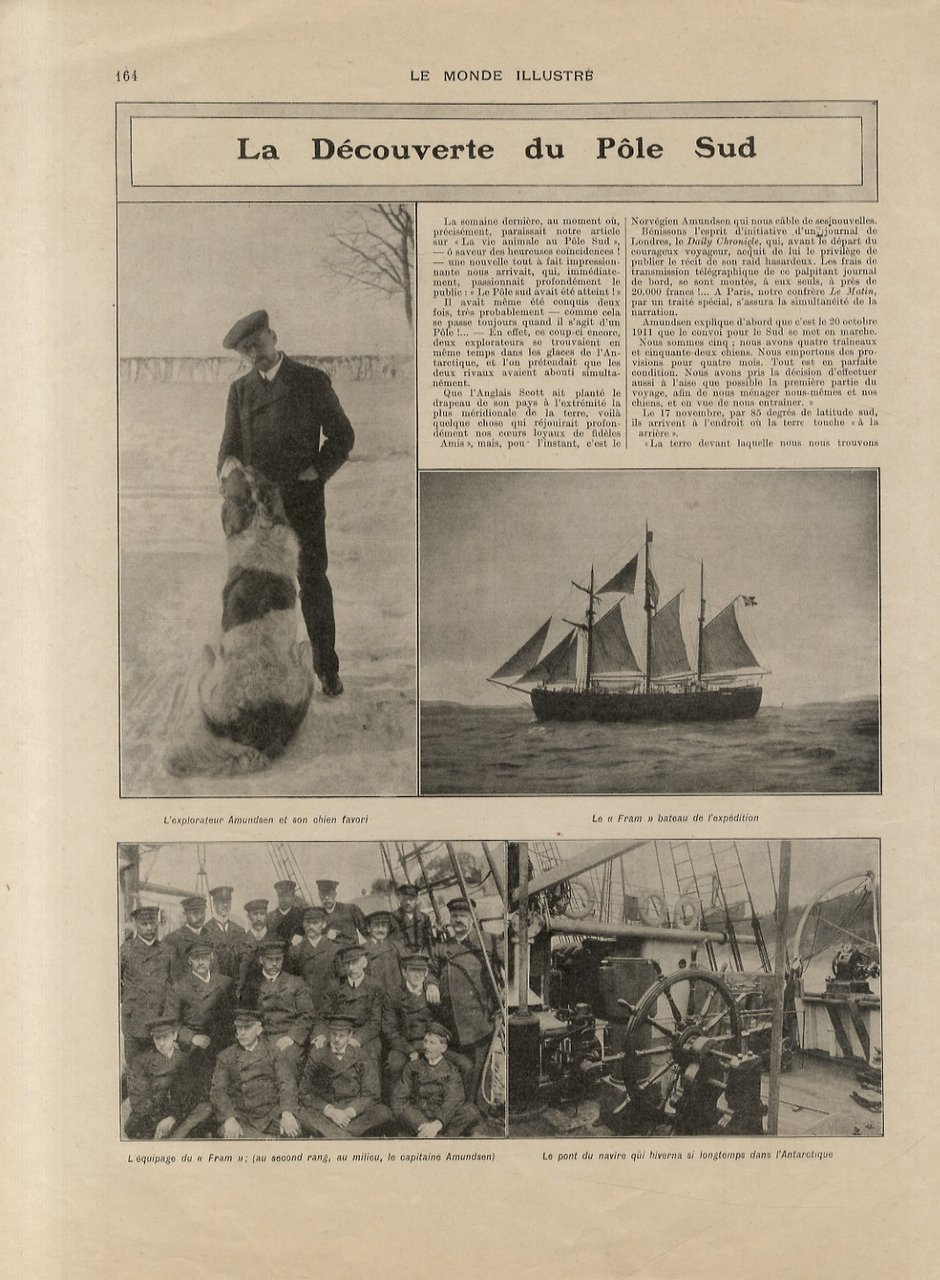 Paris, Le Monde Illustré, 1912, un fascicolo in-folio, br. editoriale, pp. 4, da 161 a 176, da 5 a 8. Con numerose illustrazioni n.t. Segnaliamo due pagine sulla conquista del Polo Sud di Amundsen e due sulla guerra Italo-Turca.