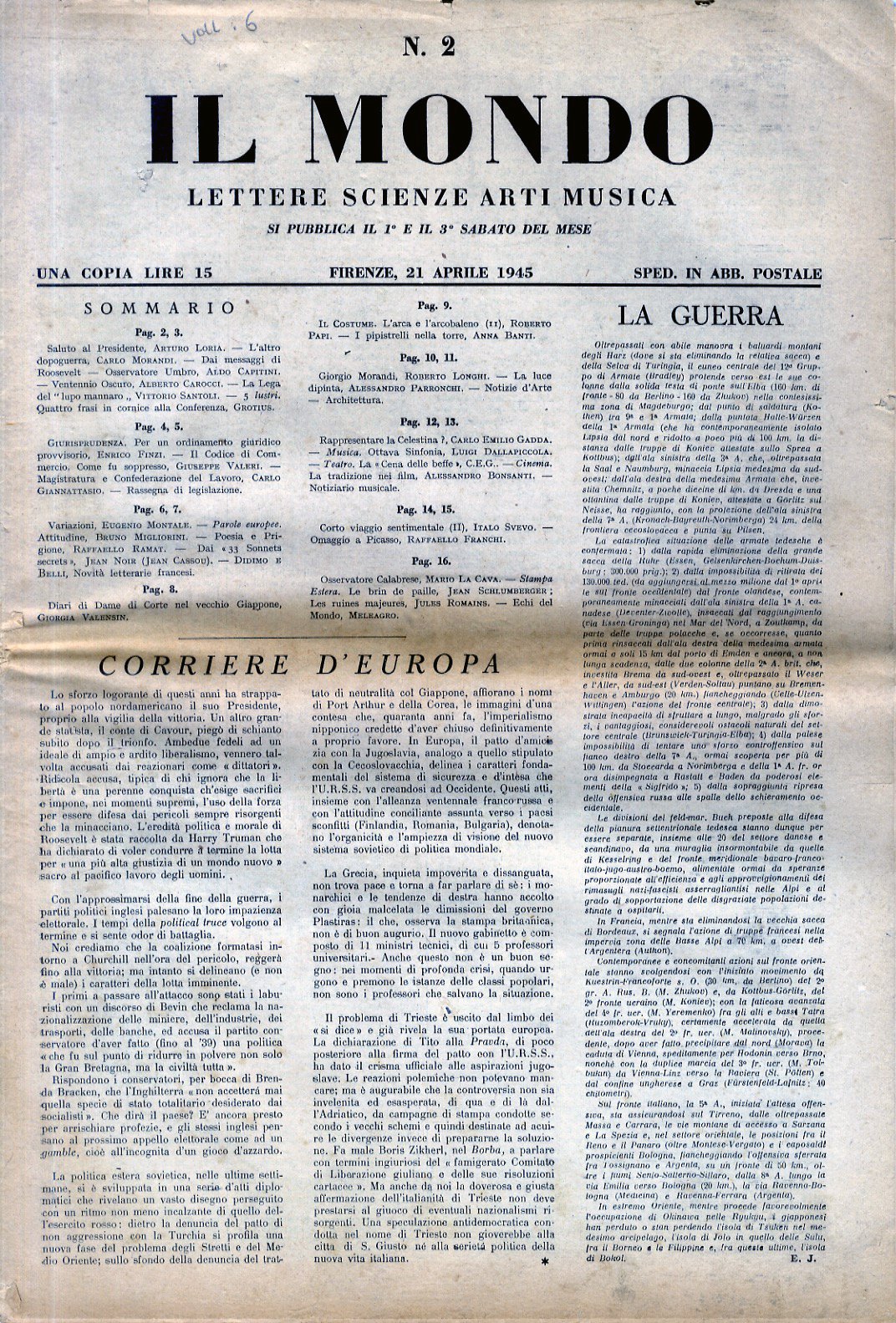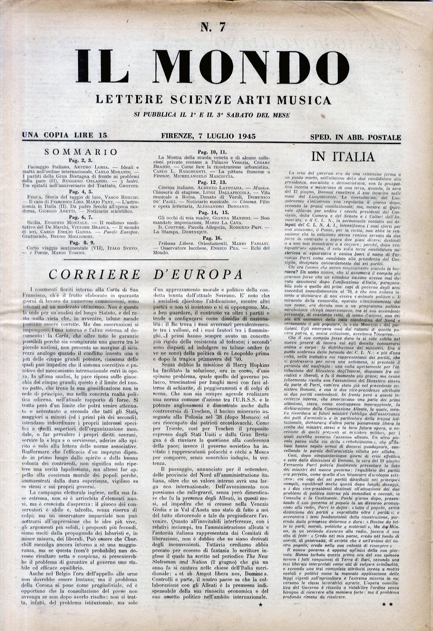 MONDO (IL). Lettere, scienze, arte, musica. [Direttore: Alessandro Bonsanti] Anno 1. 1945, fascicoli n. 2, 3, 4, 5, 6, 7.