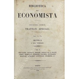 Moneta e suoi surrogati. Vol. I: (Chevalier) - Trattato delle monete; (Coquelin, Boeckh, Dureau de La Malle, Leber Humboldt) - Opuscoli sulla valutazione delle somme storiche; (Sterling, Faucher, Newmarch, Coquelin, Molinari, Di Leobardy, Lanjuinais) - Opuscoli sulle nuove scoverte e sulla smonetazione dell'oro; (Chambers e altri) - Opuscoli e dati statistici sulle zecche e sulle monetazioni; Vol. II: (Coquelin) - Del credito e dei banchi; (Ricardo) - Opuscoli bancarii; (Mac Culloch) - Moneta, Articolo estratto dalle sue note A. Smith; (Wilson) - Capitale, circolazione, banchi, ecc.; (Lawson) - Storia de' banchi nella Gran Bretagna; (Audiganne) - Banco d'Inghilterra sulla crisi del 1847; (Chevalier, Forcade, Faucher) - Istituzioni bancarie