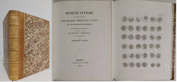 in folio, pp. XXV, 300, (2), 33, splendida leg. m. pelle coeva con fregi e tit. oro al d. con nervi, angoli, piatti in cart. dec. Tagli spruzzati. Con 33 tavv. al fine inc. in rame e molte altre incis. n.t. Le monete sono accuratamente descritte, con indici al fine. Ediz. orig. di opera fondamentale per lo studio delle monete cufiche, cioè le monete coniate dai Normanni in Italia meridionale tra l'XI e il XII sec. Il principe Domenico Spinelli(1788-1863) che fu archeologo, numismatico e collezionista, classifica e analizza le maggiori collezioni sia private che del Museo Borbonico indicando anno di conio, descrizione, peso, metallo, etc. Michele Tafuri ne cura l'edizione con un ricco apparato iconografico dell'incisore Andrea Rusco, e con caratteri tipografici arabici del testo che derivano dalla prestigiosa stamperia Bodoni. Bassoli, p.79. Mira II, 382. Splendido esempl. di opera di grande rarità. [462]