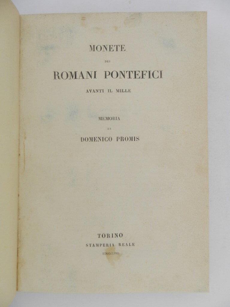 250x180 mm, pp. 109, 10 tavole fuori testo su carta forte leggermente brunite, rilegatura coeva in mezza pelle, titolo in oro su tassello al dorso, piatti marmorizzati, segnalibro in stoffa. Interessante storia della zecca papale in epoca medievale, esemplare nell'assieme molto buono. *** TUTTI I NOSTRI LIBRI SONO VISIBILI PREVIO CONTATTO MAIL O TELEFONO NELLA NUOVA SEDE DI MILANO: LIBRERIA COSMOPOLIS, VIA JOMMELLI, 22. ***