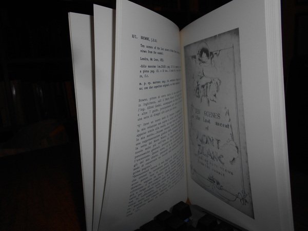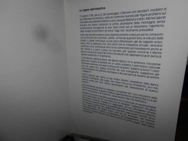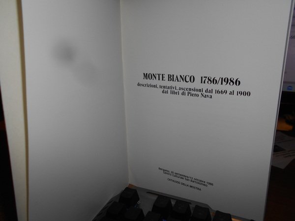 MONTE BIANCO 1786 - 1986 descrizioni, tentativi, ascensioni dal 1669 al 1900 dai libri di Piero Nava. Catalogo della Mostra. Con la partecipazione della Banca Popolare di Bergamo in occasione del bicentenario della conquista della vetta. In-8°, cartoncino edit. Pagine non numerate con alcune illustrazioni in bianco e nero n.t. In ottimo stato di conservazione. Neg. mob. 14 alto.