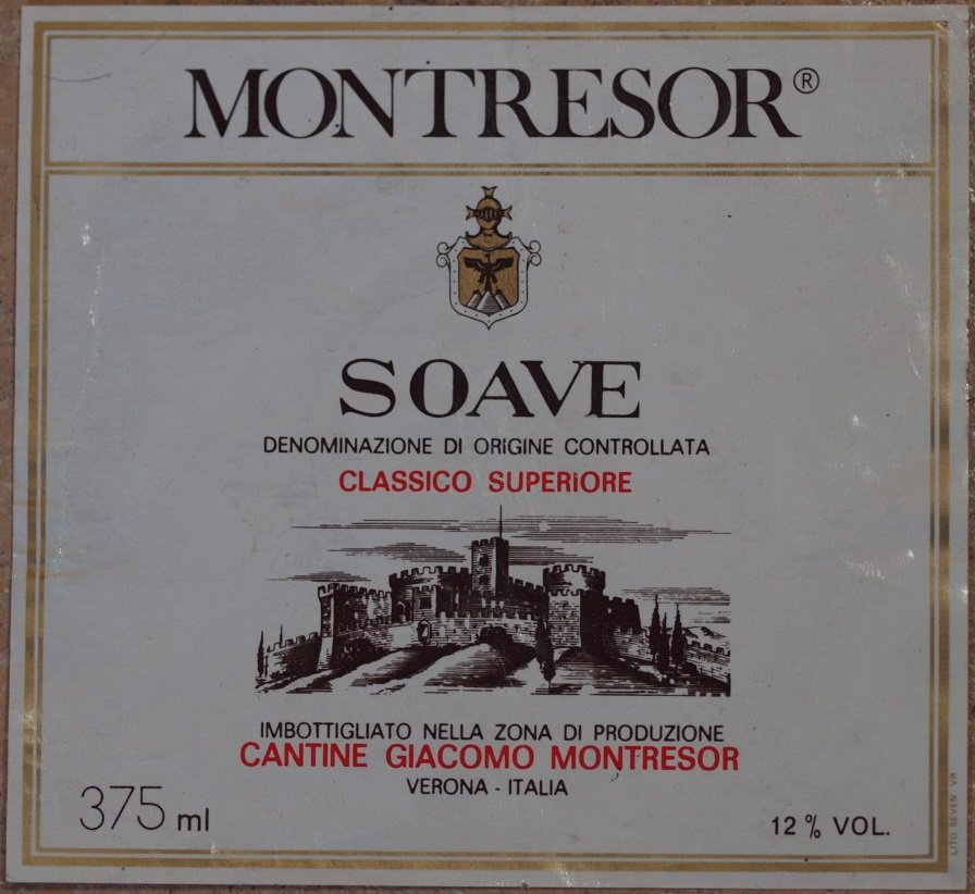 MONTRESOR SOAVE DENOMINAZIONE DI ORIGINE CONTROLLATA CLASSICO SUPERIORE IMBOTTIGLIATO NELLA ZONA DI PRODUZIONE CANTINE GIACOMO MONTRESOR VERONA ITALIA<BR>