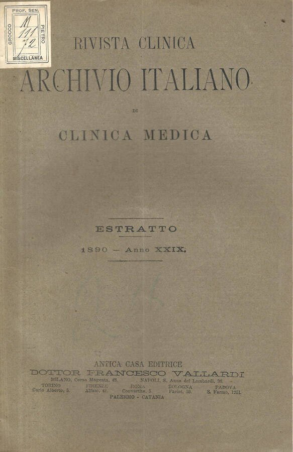 Fascicolo, prima di copertina lievemente imbrunita, con etichetta della vecchia biblioteca di appartenenza e leggero segno di matita colorata, testo completamente fruibile, con note a piè di pagina, estratto dalla Rivista Clinica Archivio Italiano di Clinica Medica, Anno XXIX, 1890 Numero Pagine 16