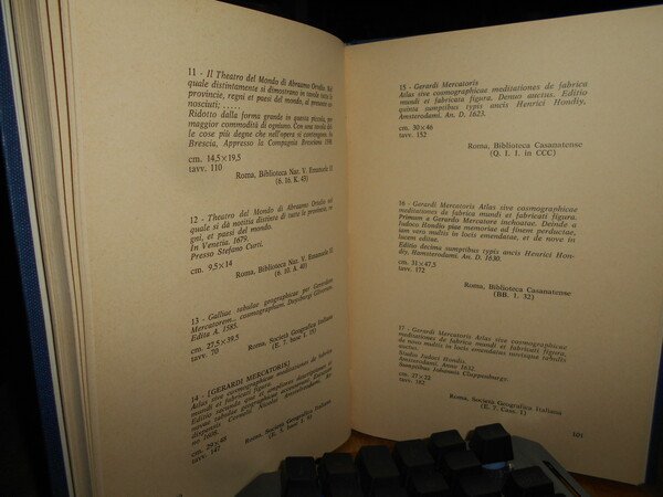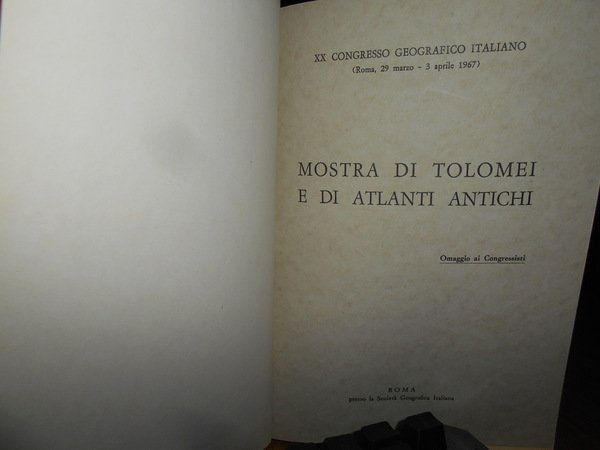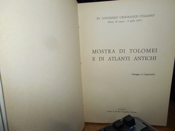 Roma, Presso la Società Geografica Italiana, 1967. MOSTRA DI TOLOMEI ANTICHI E DI ATLANTI ANTICHI. XX Congresso Geografico Italiano. In-8°, tela bleu con titolo in oro entro tassello al dorso, copertine originali conservate. 136, (1) pp. Perfetto stato di conservazione in legatura recente con le brossure originali conservate. Uff. B - III - 6 - 2