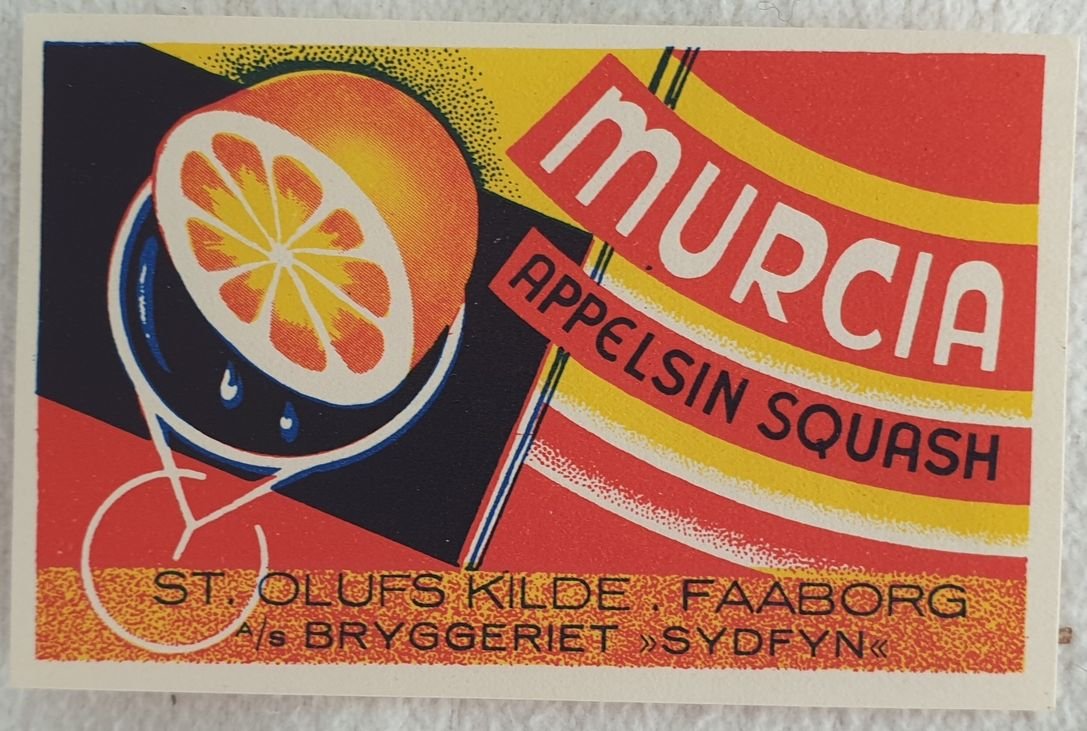 Etichetta della bevanda danese "Murcia appelsin squash". In buone condizioni. Formato cm. 6x9. Label of denmark beverage "Murcia appelsin squash". In good conditions. Size cm. 6x9.