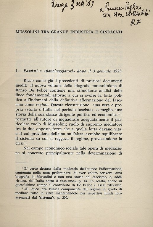 Mussolini tra grande industria e sindacati. Estratto da Quaderni Storici delle Marche. Ancona, maggio - agosto 1969.
