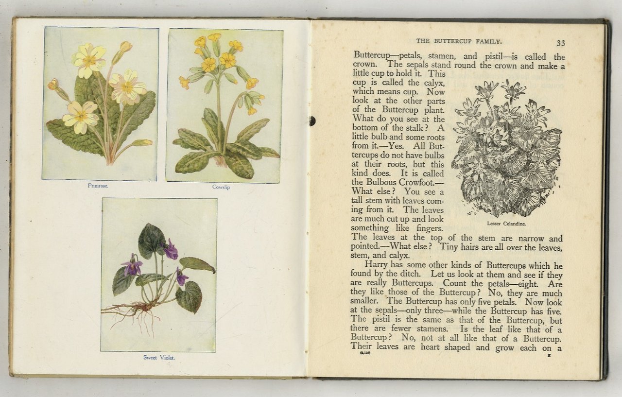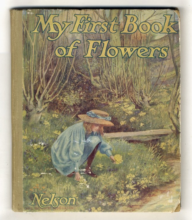 London, Thomas Nelson and Sons, Ltd., s.d. (primo ventennio del secolo XX), in-8, mezza tela editoriale con piatti in cartone, di cui l'anteriore illustrato a colori da Will Bennet Robinson (bimba che coglie fiori ai bordi di ruscello), pp. 63, (1). Graziosa antiporta figurata a colori (Anne Anderson), 21 illustrazioni botaniche a colori su 7 tavole fuori testo e 52 figure in b.n. nel testo (alcune colorate a mano). Invio manoscritto. Minime smussature agli angoli dei piatti.
