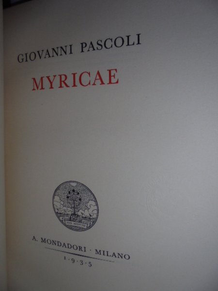 Giovanni, Pascoli. Milano, A, Mondadori, 1935. MYRICAE. In-8°, tela con titolo al dorso. XXI, 215, (1) pp. Esemplare numero fuori serie. In buono stato di conservazione. Neg. magazz. scat. 9
