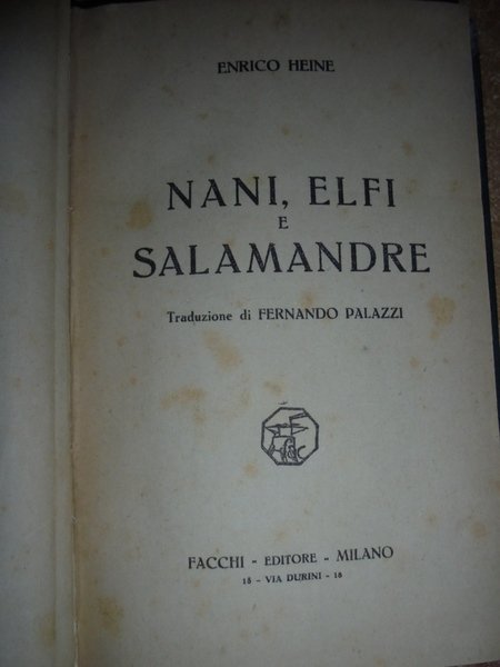 Enrico, Heine. Milano, Facchi Editore, s.d. circa 1930. Nani, Elfi e Salamandre. Traduzione di Fernando Palazzi. In-16°, m. tela edit. con piccoli angoli. 204, (1) pp. Ben conservato. Uff. pacco D. carc.