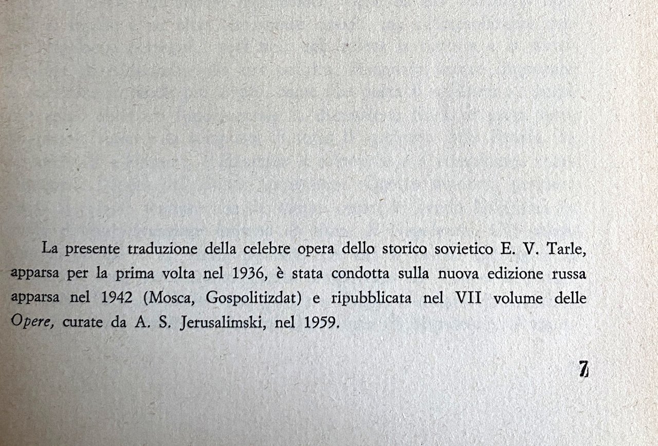 La presente traduzione della celebre opera dello storico sovietico E. V. Tarle, apparsa per la prima volta nel 1936, è stata condotta sulla nuova edizione russa apparsa nel 1942 (Mosca, Gospolitizdat) e ripubblicata nel VII volume delle Opere, curate da A. S. Jerusalimski, nel 1959. Edizione speciale per gli abbonati di Vie Nuove.