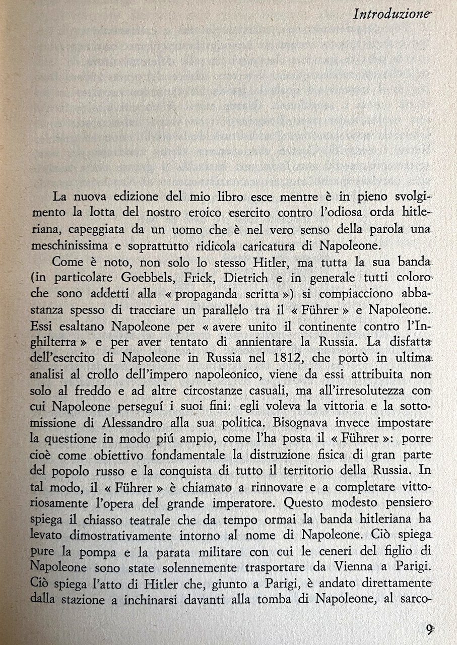 Introduzione. La nuova edizione del mio libro esce mentre è in pieno svolgimento la lotta del nostro eroico esercito contro l'odiosa orda hitleriana, capeggiata da un uomo che è nel vero senso della parola una meschinissima e soprattutto ridicola caricatura di Napoleone. Come è noto, non solo lo stesso Hitler, ma tutta la sua banda (in particolare Goebbels, Frick, Dietrich e in generale tutti coloro che sono addetti alla propaganda scritta) si compiacciono abbastanza spesso di tracciare un parallelo tra il Führer e Napoleone. Essi esaltano Napoleone per avere unito il continente contro l'Inghilterra e per aver tentato di annientare la Russia. La disfatta dell'esercito di Napoleone in Russia nel 1812, che portò in ultima analisi al crollo dell'impero napoleonico, viene da essi attribuita non solo al freddo e ad altre circostanze casuali, ma all'irresolutezza con cui Napoleone perseguì i suoi fini: egli voleva la vittoria e la sottomissione di Alessandro alla sua politica. Bisognava invece impostare la questione in modo più ampio, come l'ha posta il Führer: porre cioè come obiettivo fondamentale la distruzione fisica di gran parte del popolo russo e la conquista di tutto il territorio della Russia. In tal modo, il Führer è chiamato a rinnovare e a completare vittoriosamente l'opera del grande imperatore. Questo modesto pensiero spiega il chiasso teatrale che da tempo ormai la banda hitleriana ha levato dimostrativamente intorno al nome di Napoleone. Ciò spiega pure la pompa e la parata militare con cui le ceneri del figlio di Napoleone sono state solennemente trasportare da Vienna a Parigi. Ciò spiega l'atto di Hitler che, giunto a Parigi, è andato direttamente dalla stazione a inchinarsi davanti alla tomba di Napoleone, al sarcofago del Palazzo degli Invalidi, e altre trovate istrionesche della stessa risma. Pur considerando sommamente ridicolo e caricaturale ogni tentativo di paragonare seriamente un insignificante pigmeo con un gigante, vale la pena di spendere alcune parole sulle differenze profonde, radicali, che contraddistinguono il terreno storico del primo impero francese e il terreno sul quale la banda hitleriana ha inscenato la sua danza odiosa e sanguinaria. Questa cricca di uomini incolti, in cui una mente rozza come Rosenberg e un vacuo imbrattacarte come Goebbels sono considerati addirittura degli eruditi, non ha proibito sinora i versi di Goethe che suonano acerba condanna per essa, certamente perché non li ha mai letti. La situazione storica nella quale cominciò, si sviluppò e finì la straordinaria carriera di Napoleone fu tale che gli toccò in parte nella storia della Francia, ma soprattutto nella storia dei paesi da lui assoggettati, di avere per lungo tempo una certa funzione progressiva. Perfino nella stessa Francia il suo dispotismo militare conservò non poche conquiste della rivoluzione che indubbiamente avevano un carattere progressivo. Non a caso Pusckin, al pari di molti pubblicisti e storici del suo tempo, chiamò Napoleone erede e affossatore della rivoluzione. Non solo affossatore ma anche erede. Certo, Napoleone distrusse tutti i germi di libertà politica che avevano cominciato a sorgere con la rivoluzione. Egli troncò brutalmente il movimento appena iniziato che, pur con grandi arresti a deviazioni, tendeva comunque ad istaurare un regime borghese-costituzionale. Napoleone soffocò in Francia ogni ricordo, ogni segno di libertà politica. La più piccola opposizione alla sua volontà, alle sue disposizioni era da lui vista come un delitto di Stato. Sotto di lui non vi fu traccia di libertà di parola, né di stampa, né di riunione. ...