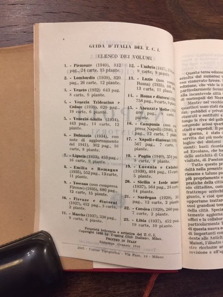567 p. con 7 carte geografiche, 14 piante di città e 45 piante di edifici; 16 cm. Leg. in tela editoriale rossa, sovracoperta. Molto buono