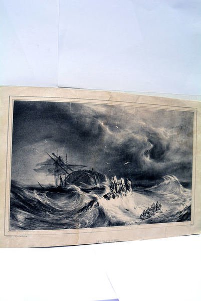 Dimensions: 25 (20) x 36,5 (24,5) Cm. Déchirure sur le bord ainsi que sur l'image. Tâche de mouillure sur la partie gauche de la feuille. Une autre tâche moins importante côté droite. Cette jolie lithographie montre le drame d'un naufrage et les marins qui essayent de survivre et de sauver ses collegues dans leur petit bateau de sauvetage. M. Lemercier est un des lithographes qui ont introduit dans cet art les innovations et les progrès les plus remarquables : Il a le premier songé à aciduler et à gommer les pierres par une seule opération, en se servant d'un mélange d'acide nitrique et de gomme qu'il applique sur la pierre avec un très-large pinceau. Cette heureuse modification fait gagner un temps précieux, en permettant d'obtenir sur-le-champ des épreuves d'une pierre qu'on ne pouvait tirer que le lendemain.