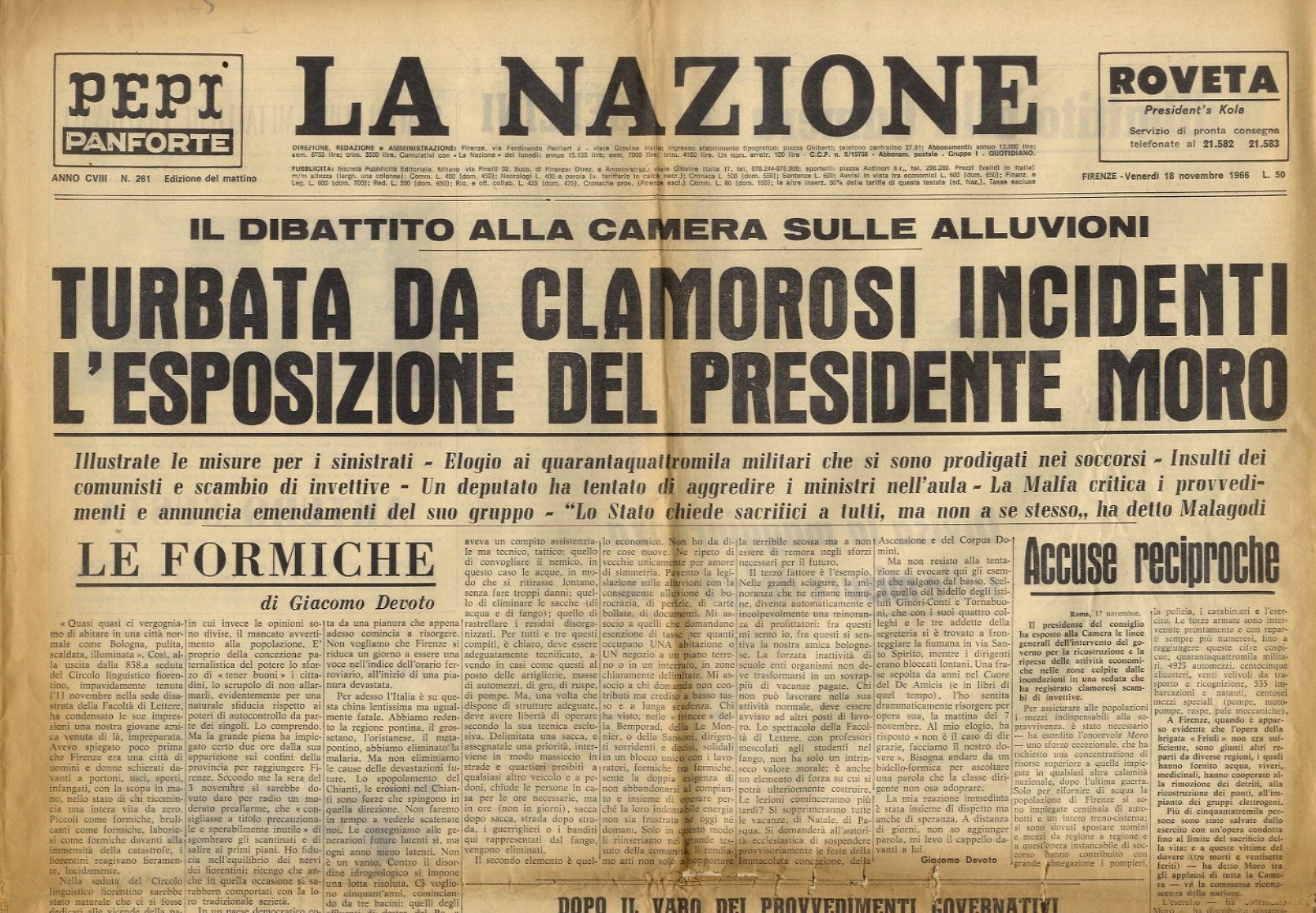 NAZIONE (LA). Anno CVIII. N. 261. Edizione del mattino. Venerdì 18 novembre 1966.