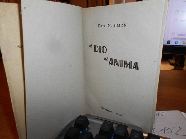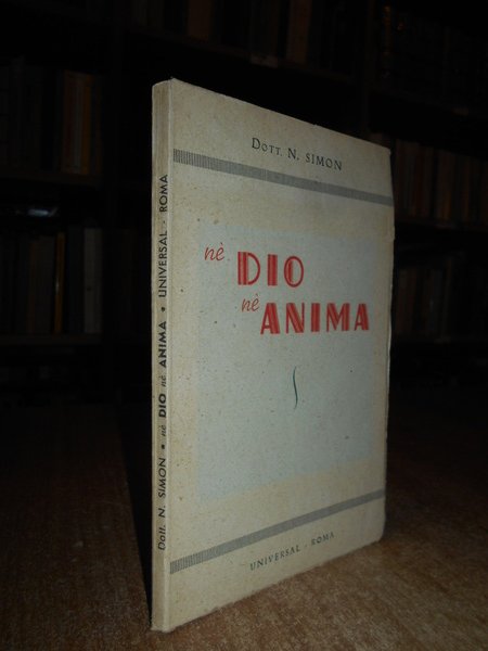 Dott. N. SIMON - Roma, Universal, senza data (c. 1960). Nè DIO Nè Anima. In-16°. br., 91 pp. Non comune. Con piccolo strappo angolare nella cop. posteriore. Neg. esot. mob. 102