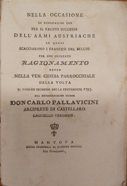 NELLA OCCASIONE di ringraziar Dio per il fausto successo dell'armi austriache le quali scacciarono i Francesi dal Belgio per essi occupato. Ragionamento detto nella Ven. Chiesa Parrocchiale della Volta il giorno secondo della Pentecoste 1793, dal Reverendissimo Signor. Arciprete di Castellaro Lagusello Veronese.