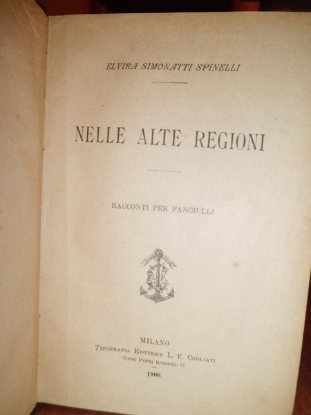 Nelle Alte Regioni racconti per fanciulli. Elvira Simonatti Spinelli. Milano, Tipografia Editrice L. F. Cogliati, 1900. Indice: Dedica - Ai giovani lettori - Cuore africano - Il collare di Boby - Coscritto - Una madre - Per una pesca - Nelle alte regioni - Amicizia - Imprudenza fatale - Anima forte - In Caserma - Piero - Perdono - Ridi pagliaccio - Il viandante di Natale. In - 8°, m. tela. 228 pp. Dedica nella seconda carta bianca. Ben conservato. Neg. mob. nero 9
