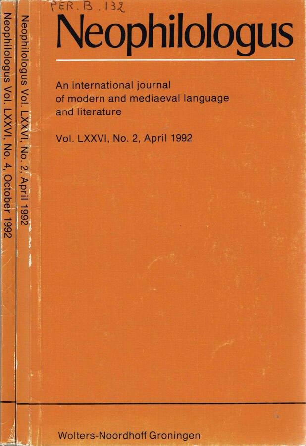 Anno 1992 incompleto, presenti due dei quattro numeri usciti nell'anno, N. 2 aprile e N. 4 ottobre, LXXVI volume della collana Neophilologus - An International journal of modern and mediaeval language and literature. Due fascicoli in buono stato, coperta in cartoncino patinato, alcuni segni di sfregamento, tagli poco ambrati con minime tracce di fioritura, cerniera stretta, pagine in ottimo stato. Presentano catalogazione bibliotecaria manoscritta su piatto anteriore, timbro ex biblioteca sul margine di piede di qualche pagina; nel fascicolo N. 4 ottobre allegato spillato con frontespizio del volume ed Indice, timbro ex biblioteca e macchia su frontespizio. Lingue: Inglese, Francese, Tedesco. Numero Pagine 315, numerazione delle pagine in sequenza