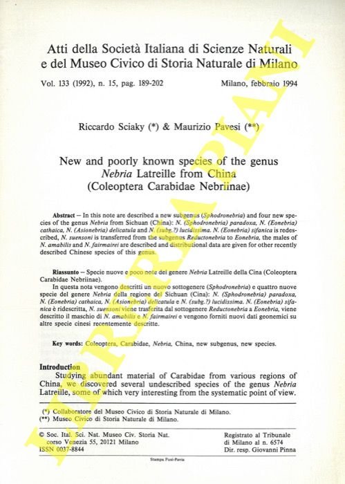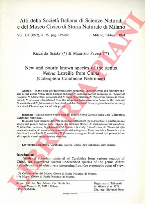 New and poorly known species of the genus Nebria Latreille from China (Coleoptera Carabidae Nebriinae) .